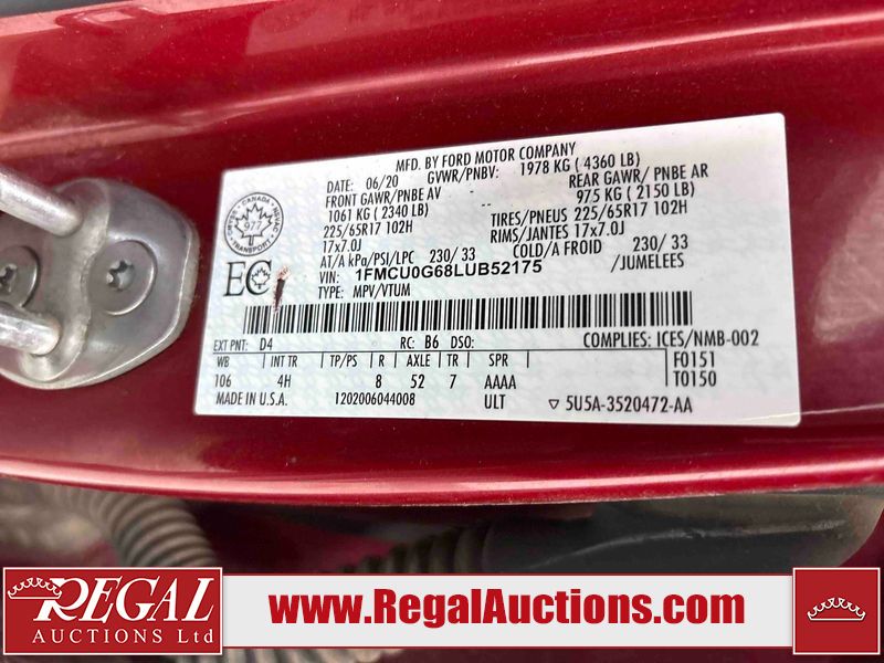 This 2020 FORD ESCAPE 4D SPORT UTILITY is powered by a cylinder gasoline engine and an automatic transmission. It is equipped with four wheel drive. The SUV has seats for 5 people. The SUV has high mileage for its age. The vehicle has high value options including leather upholstery, power seats, heated seats, navigation, and a backup camera. The Tire Pressure light is on. The vehicle has some mechanical problems. The engine is making abnormal noise. (See Footnote 1) The body looks to be in rough condition overall. The hood, left front door, left rear door, left rear fender, rear door, right rear fender, right rear door, right front door, and right front fender have been repainted poorly. There is severe dent damage on the right front door and right front fender. The right front door is broken. There is a fair amount of paint overspray on the front bumper. The rear bumper has been repainted poorly. There is slight dent damage on the rear bumper and rear door. There are very minor chips in many areas around the body. There are very minor scratches in many areas around the body. There is very minor dent damage in a few areas around the body. The interior looks to be in good condition overall. The front and rear seats are dirty. The passenger side mirror housing is broken. The windshield is chipped and cracked. All of the tires have lots of tread remaining. This SUV is being sold by an automotive broker. The vehicle will be sold with the following declarations: Claims Total Above $20,000 (See Footnote 2). Footnotes: 1) We've identified some mechanical problems with the vehicle. However, the vehicle has not undergone a mechanical inspection and our findings are not to be considered a complete evaluation of the vehicle's mechanical condition. Review our Buyer Protection Policy to see how Regal Auctions protects you from undisclosed mechanical problems. 2) The vehicle's total recorded insurance claims history is above $20,000. This is the amount of money that was paid out by an insurance company for repairs to cover claims against the vehicle's insurance policy. This information is provided by CarFax. Regal Auctions Ltd. makes no guarantee or warranty, either express or implied, with respect to the data provided in this report. The information has been provided from the consignor and from sources generally believed to be reliable, however the accuracy of this information cannot be guaranteed by Regal Auctions.
