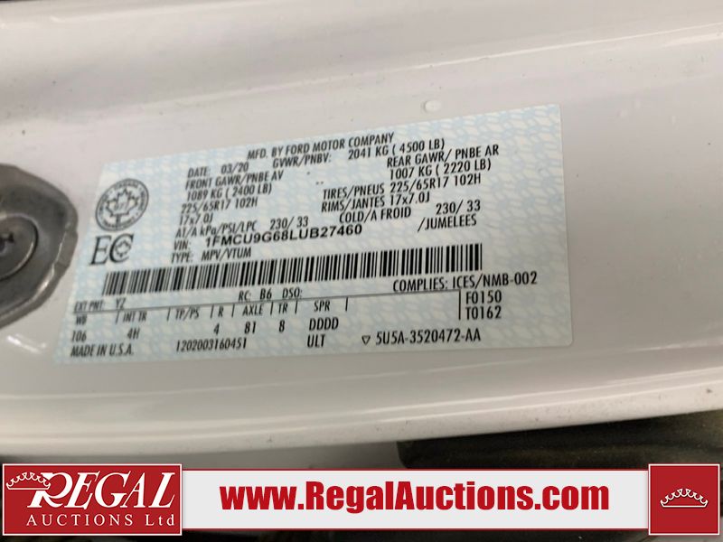 This 2020 FORD ESCAPE SE 4D UTILITY AWD 1.5L is powered by a 3 cylinder gasoline engine and an automatic transmission. It is equipped with four wheel drive. The SUV has seats for 5 people. The mileage is average considering the SUV's age. The vehicle has high value options including power seats, heated seats, and a backup camera. The body looks to be in fair condition overall. There are chips on the front bumper, hood, roof, rear bumper, rear door, right rear door, and right front fender. There are scratches on the front bumper, left rear door, and rear bumper. There are very minor chips in many areas around the body. There are very minor scratches in many areas around the body. There is very minor dent damage on the left front door. The interior looks to be in fair condition overall. The passenger seat and rear seats are stained. The carpet is dirty. The roof liner is dirty. The windshield looks to be in good condition. All of the tires have lots of tread remaining.