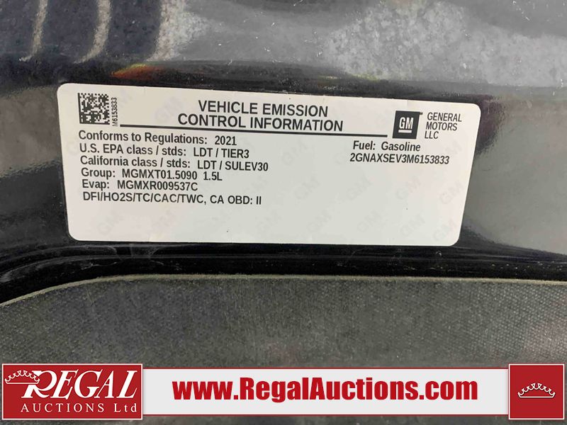 This 2021 CHEVROLET EQUINOX LS 4D SPORTS UTILITY AWD is powered by a turbocharged 1.5 liter 4-cylinder gasoline engine and an automatic transmission. It is equipped with all-wheel drive. The SUV has seats for 5 people. The SUV has high mileage for its age. The vehicle has high-value options, including power seats, heated seats, and a backup camera. The body looks to be in good condition overall. There are chips on the front bumper and hood. There are minor scratches on the left rear door, left rear fender, and right front door. There is dent damage on the right rear fender and right front door. There are scratches in many areas around the body. There are chips in a few areas around the body. The interior looks to be in good condition overall. The windshield is chipped. All of the tires have lots of tread remaining. This SUV is being sold by an automotive broker. Regal Auctions Ltd. makes no guarantee or warranty, either express or implied, with respect to the data provided in this report. The information has been provided from the consignor and from sources generally believed to be reliable, however the accuracy of this information cannot be guaranteed by Regal Auctions.