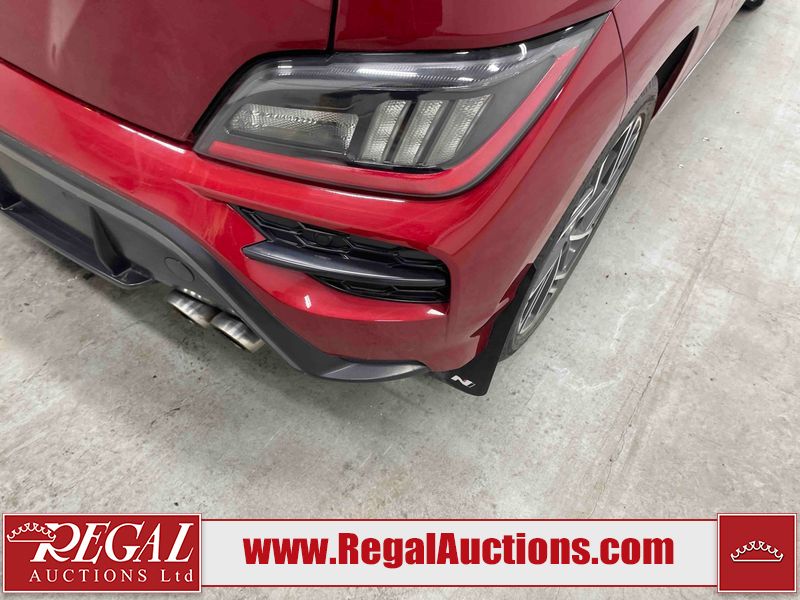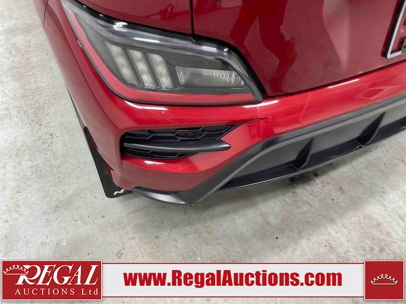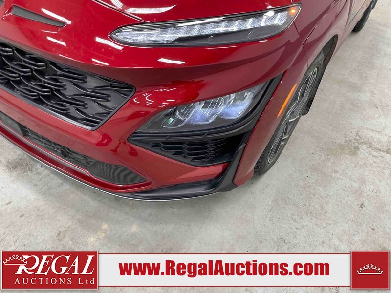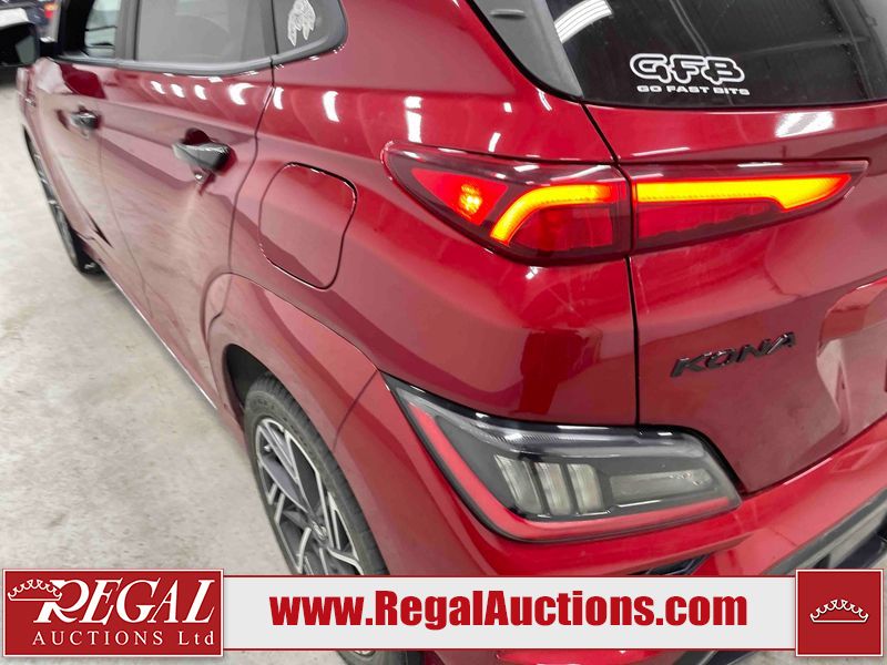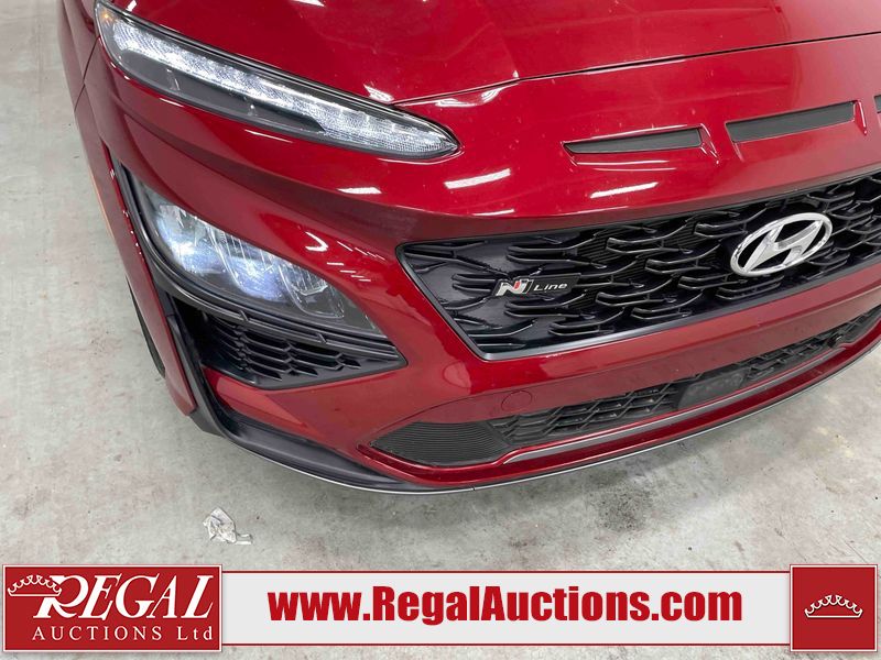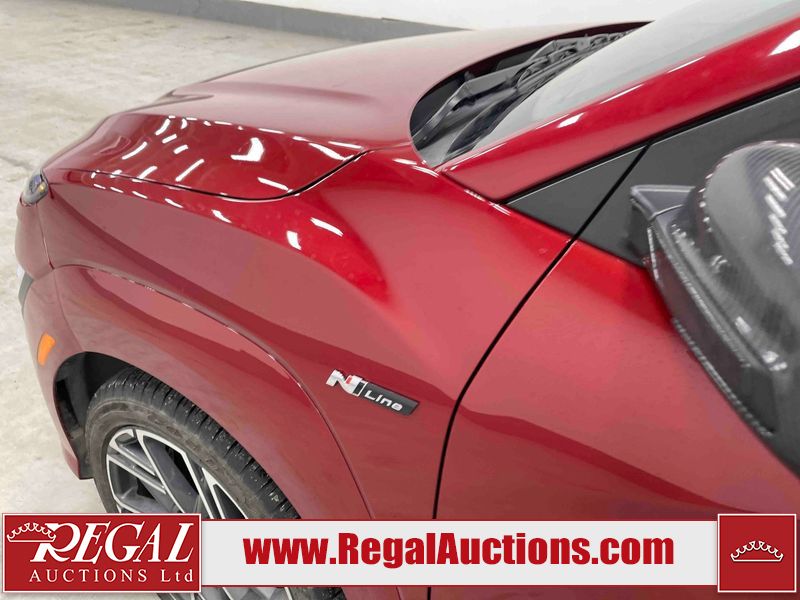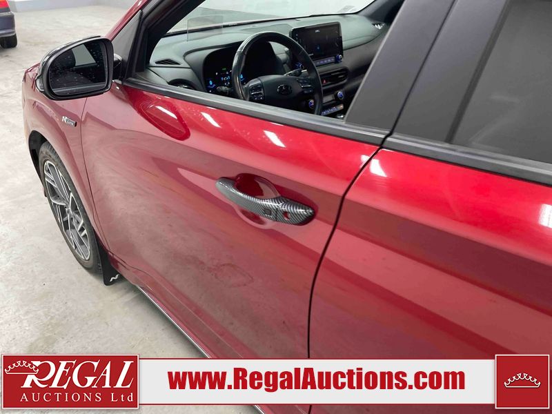This 2023 HYUNDAI KONA N LINE 4D UTILITY AWD 1.6L is powered by a turbocharged 4 cylinder gasoline engine and an automatic transmission. It is equipped with four wheel drive. The SUV has seats for 5 people. The SUV has low mileage for its age. The vehicle has high value options including a sunroof, leather upholstery, power seats, heated seats, and a backup camera. The body looks to be in fair condition overall. There are slight chips on the front bumper, grille, and hood. There are incidental scratches on the front bumper, hood, and rear bumper. There is dent damage on the right rear fender. There are very minor chips in many areas around the body. There are very minor scratches in many areas around the body. The interior looks to be in fair condition overall. The rear seats are worn. The carpet is dirty. The windshield is chipped. All of the tires have lots of tread remaining.