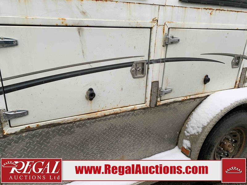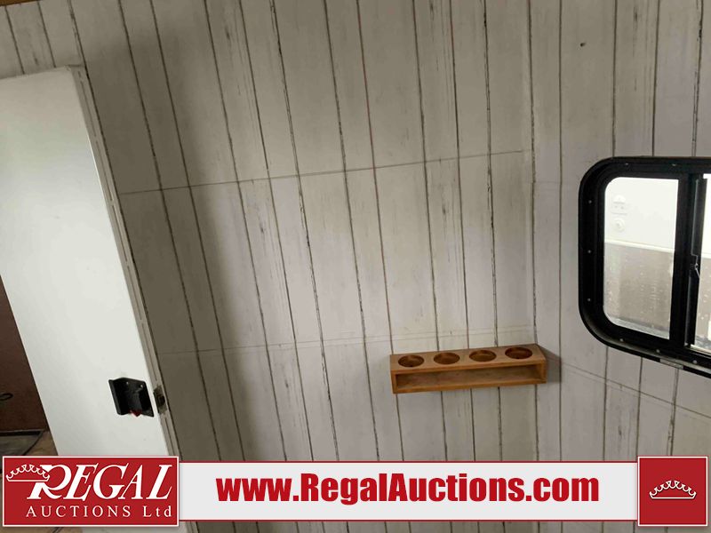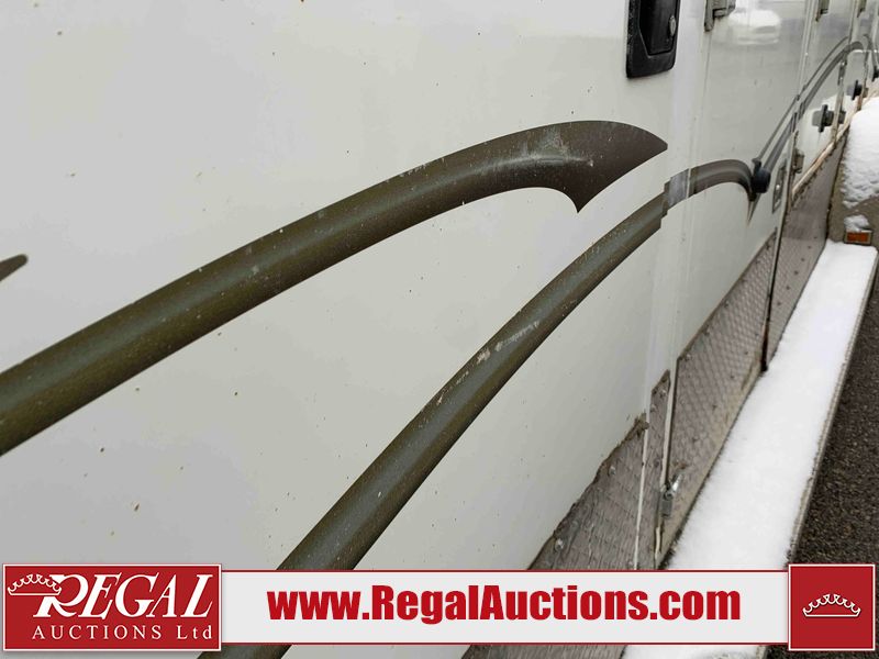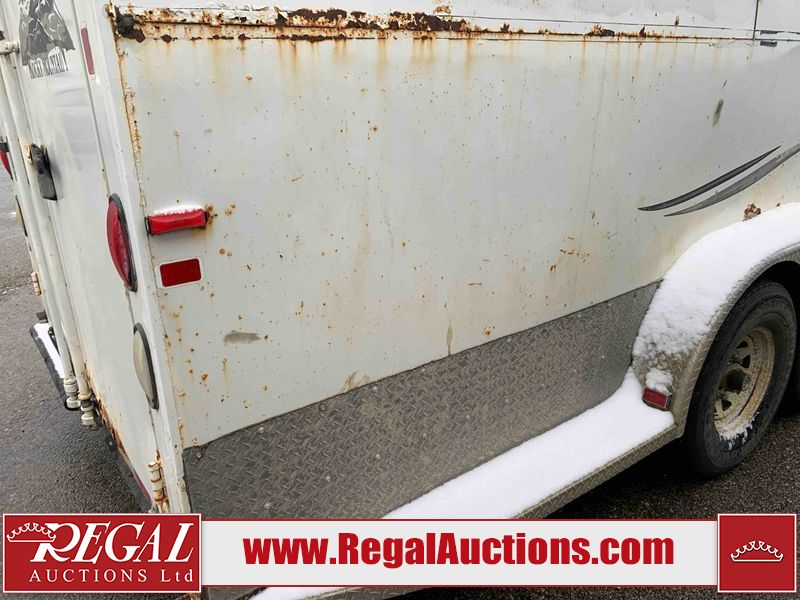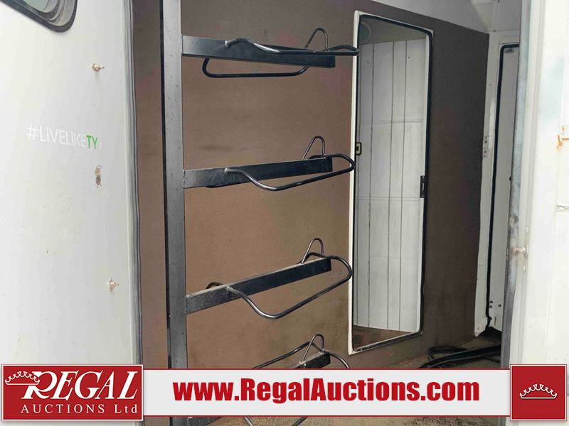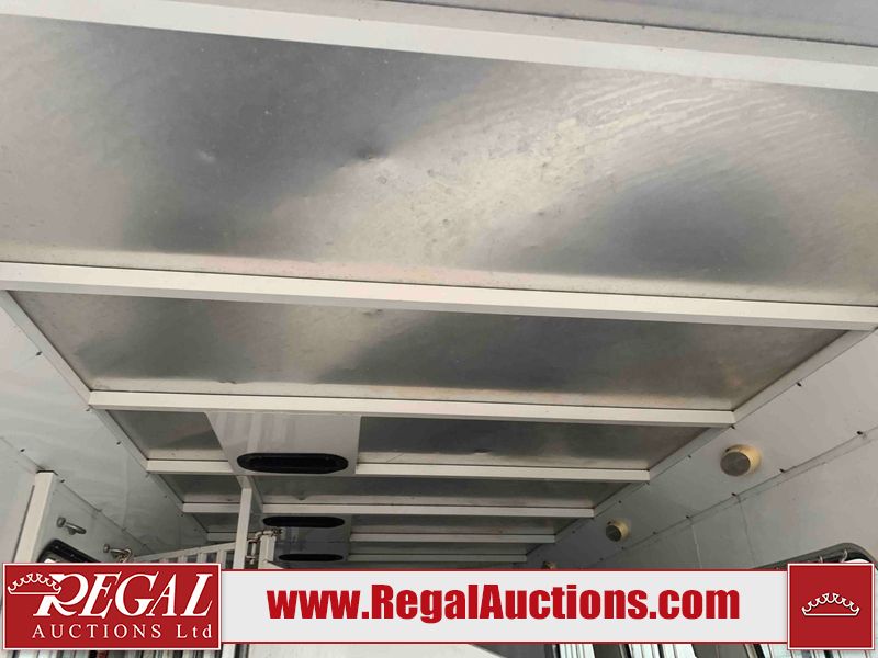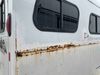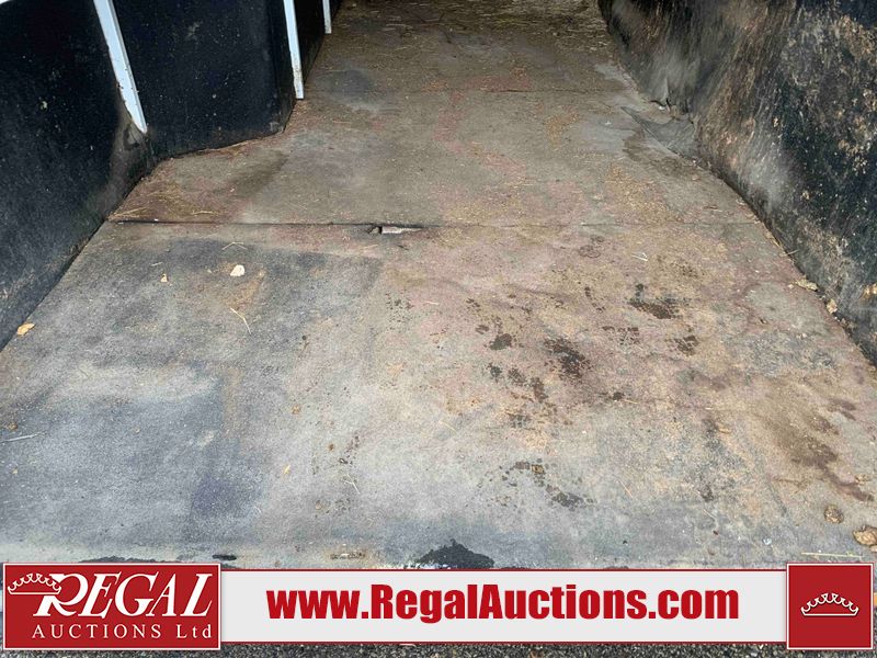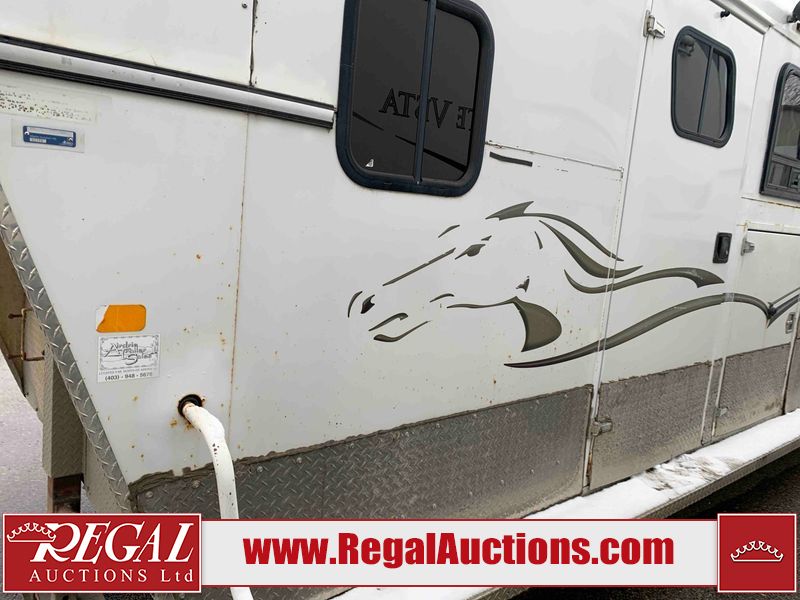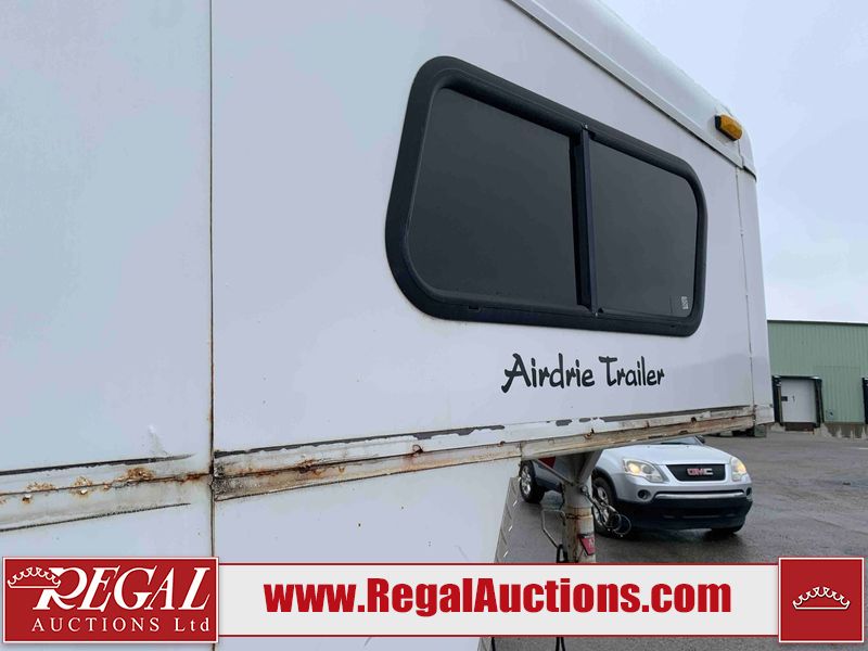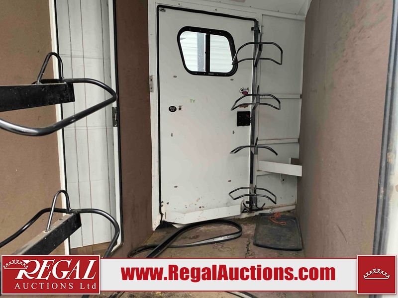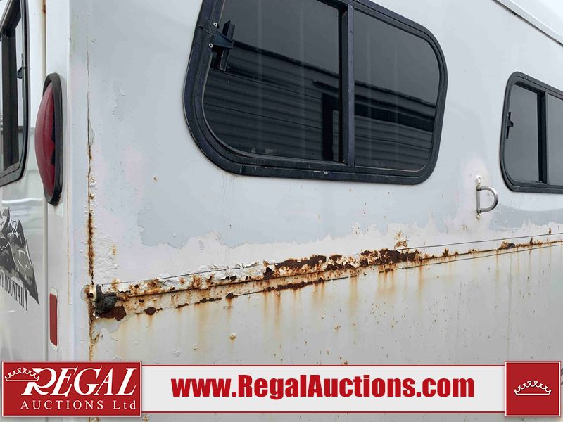This 49 foot horse trailer is a 2005 trails West Manufac Tandem axle fifth wheel. It has a dual door entry. The interior is dirty. Interior floors are made of rubber matting. Some areas of the floor are torn. The right wall matting is torn. There are scratches and scuffs on all panels. The tack room door trims are separating. The roof is showing water damage. The wallpaper is lifting. Exterior walls are made of hard wall fiberglass. The frame has surface rust. The front end is showing scratches and scuffs. The front shield and roof has hail damage. All aluminum panels have been poorly resealed. Most of the left and right wall weatherstripping has been removed. All panels have been repainted. Some decals are peeling. The rear doors have penetrating rust. The right wall has peeling paint. The right front wall is cracked. This unit gets power with external power applied. This unit is missing a battery. The tires are mounted to steel rims and appear to be in good enough condition for use. This unit is equipped with a stereo system.