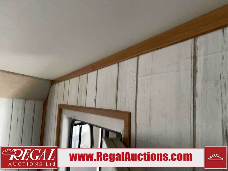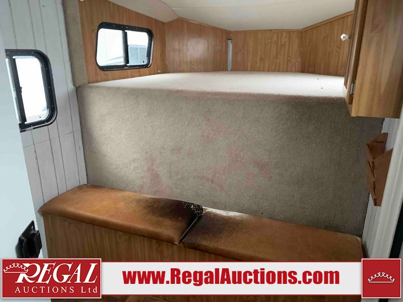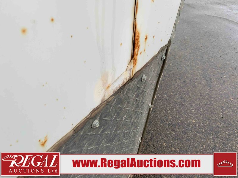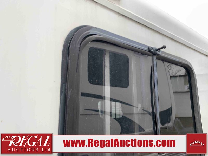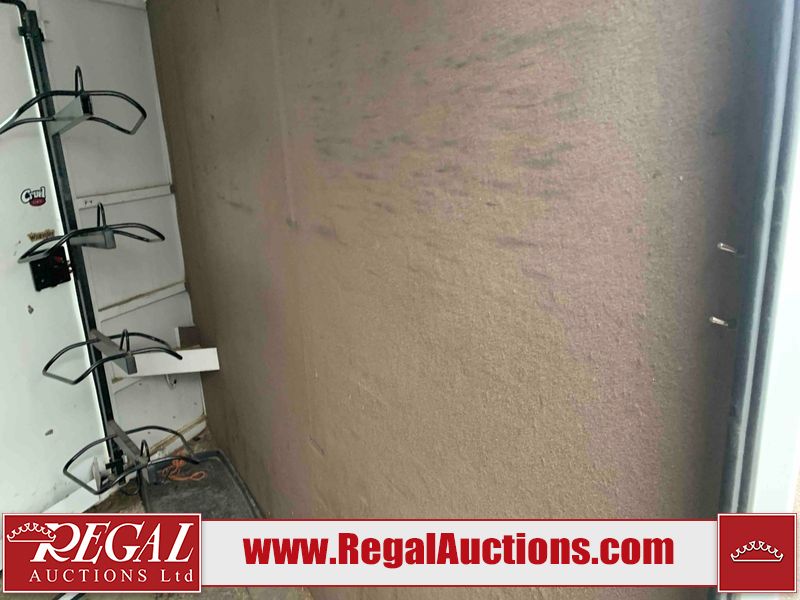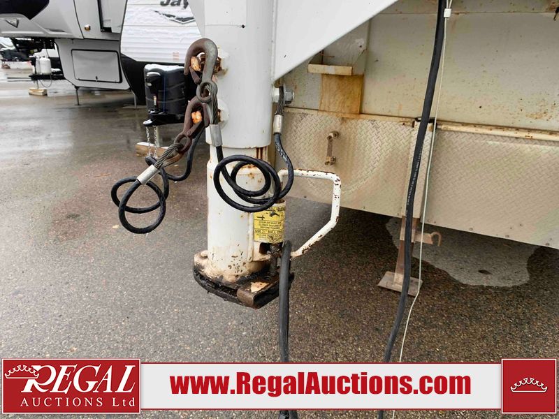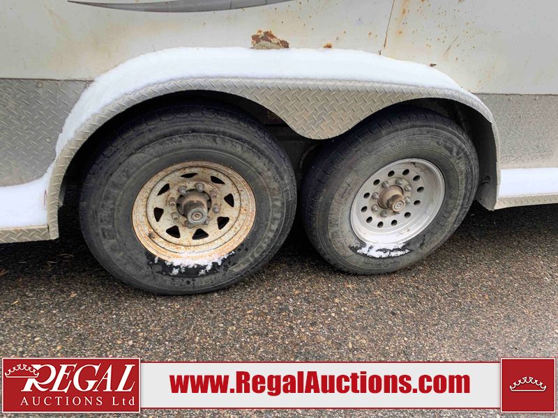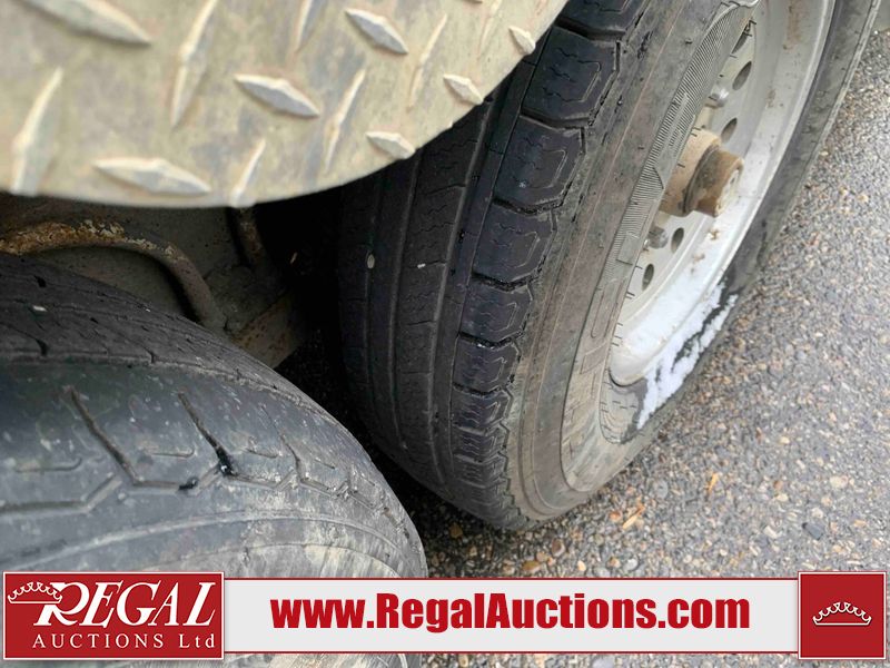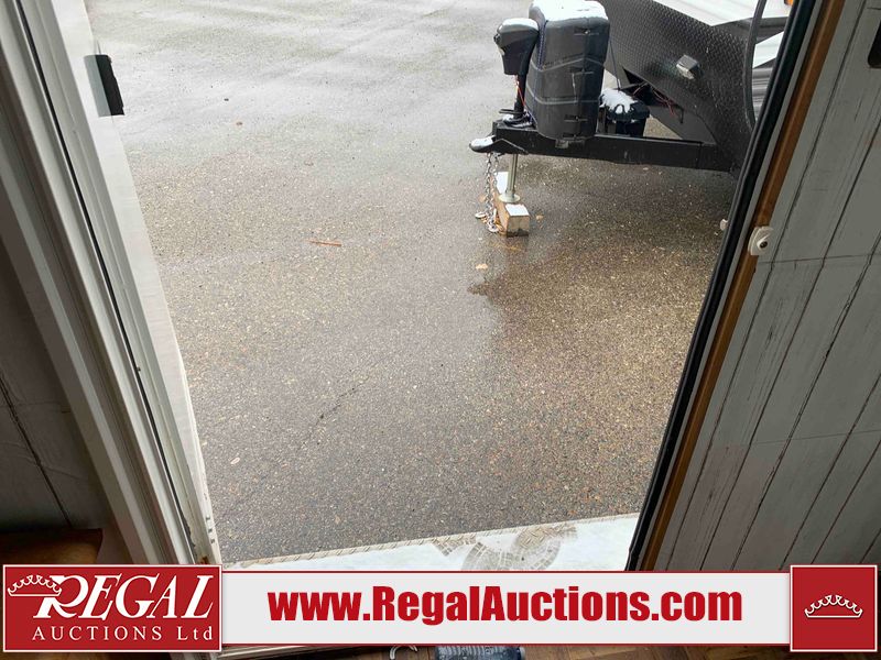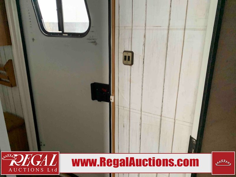 This 49 foot horse trailer is a 2005 trails West Manufac Tandem axle fifth wheel. It has a dual door entry. The interior is dirty. Interior floors are made of rubber matting. Some areas of the floor are torn. The right wall matting is torn. There are scratches and scuffs on all panels. The tack room door trims are separating. The roof is showing water damage. The wallpaper is lifting. Exterior walls are made of hard wall fiberglass. The frame has surface rust. The front end is showing scratches and scuffs. The front shield and roof has hail damage. All aluminum panels have been poorly resealed. Most of the left and right wall weatherstripping has been removed. All panels have been repainted. Some decals are peeling. The rear doors have penetrating rust. The right wall has peeling paint. The right front wall is cracked. This unit gets power with external power applied. This unit is missing a battery. The tires are mounted to steel rims and appear to be in good enough condition for use. This unit is equipped with a stereo system.