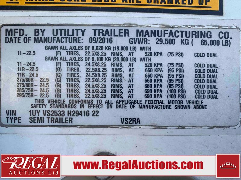 This unit is a 2017 Utility 53ft 3000R Tandem axle reefer trailer. It's GVWR is 65,000 pounds. It's CVP expiry is 09/2025. The interior walls are showing scratches and scuffs normal with average use. The front end is gouged and scratched. All panels are showing scratches, scuffs, and dents. The rear bumper is bent. The rear right signal deflector is broken. This unit is equipped with a Carrier reefer unit. This unit starts and runs without a boost. The engine metre show 13,284 hours. The tires are mounted to steel rims and appear being good enough condition for use. This unit is equipped with rear sliding axles, ABS, air brakes, and air suspension.