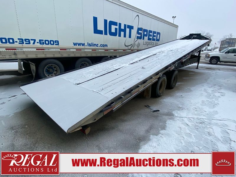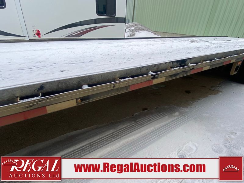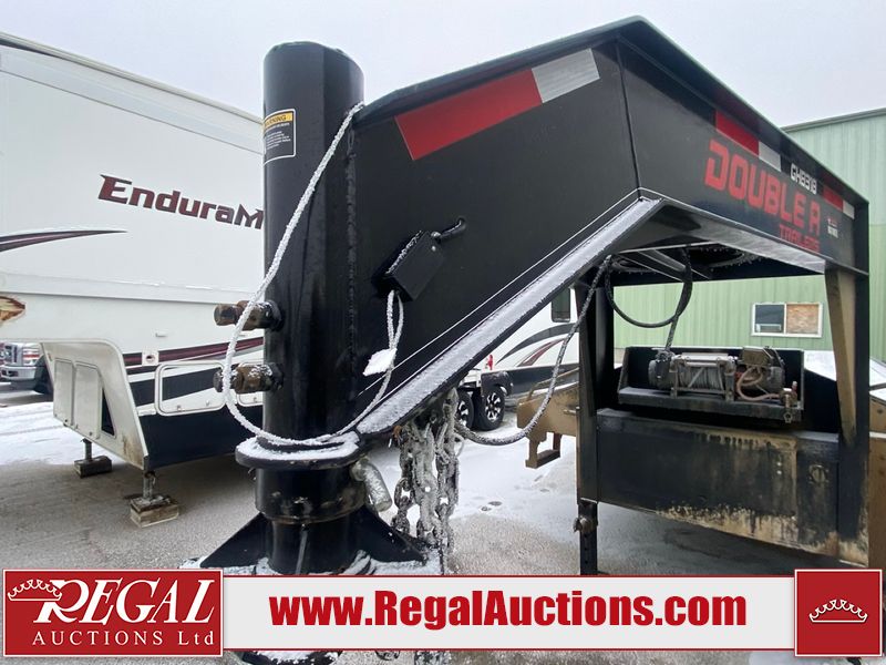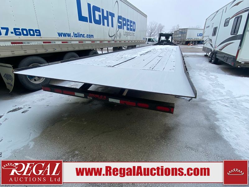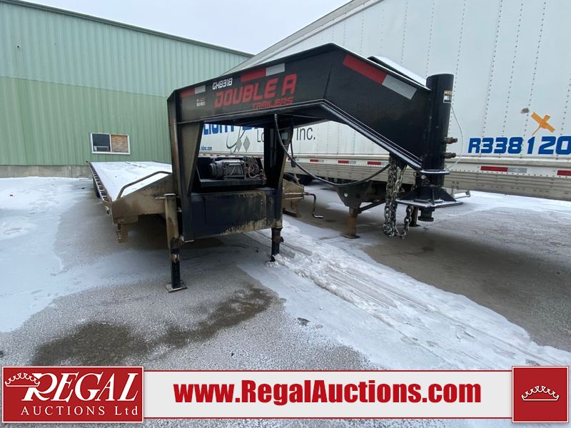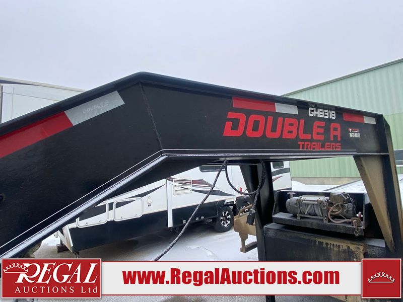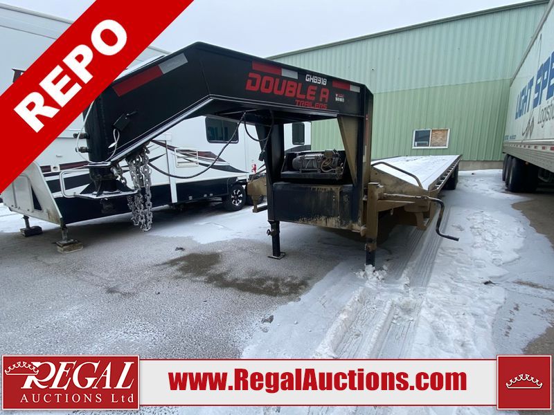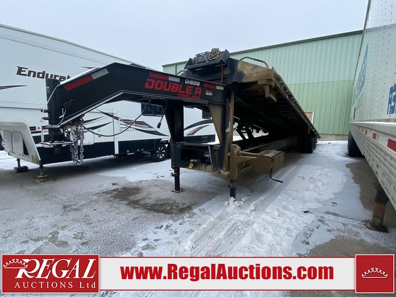 This unit is a 2025 40 foot Double A GHB318 model tilt deck goose neck trailer. It’s GVWR is 30,000 pounds. The deck is made of wood. This unit is covered in dust. Dirt, not all damages can be determined. Some of the frame has chips and peeling paint. This unit gets power with external power applied, the battery is weak. This unit’s hydraulics are operational but are leaking. The tires are mounted to alloy rims and appeared to be in good enough condition for use. This unit is equipped with a winch, and a torque tube system tilt deck.
