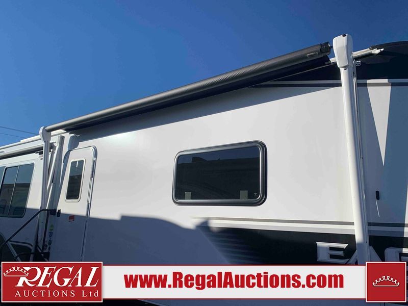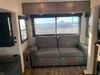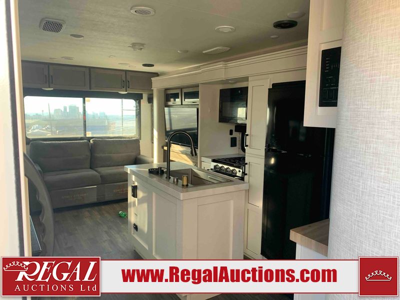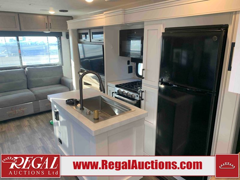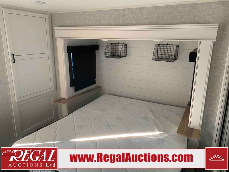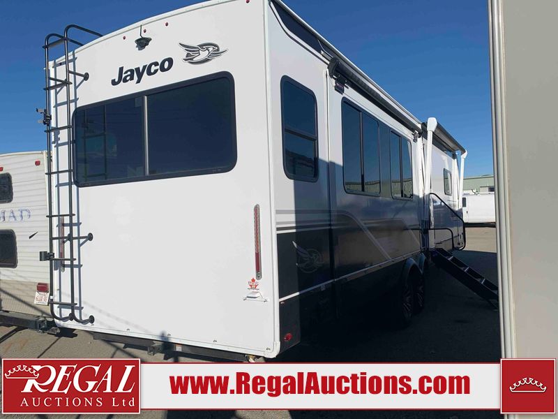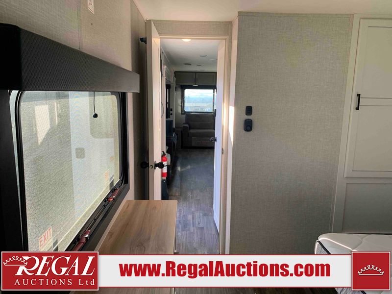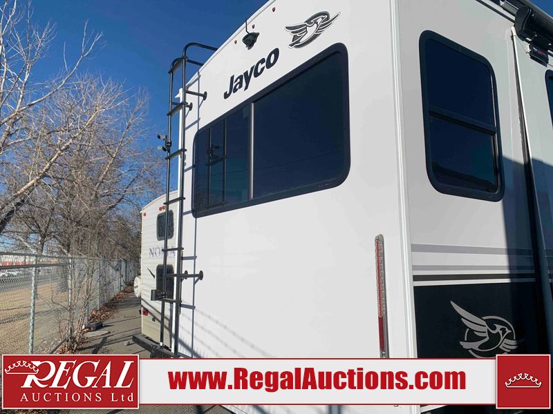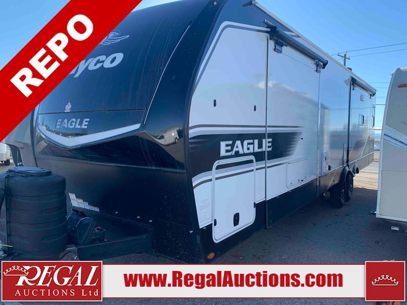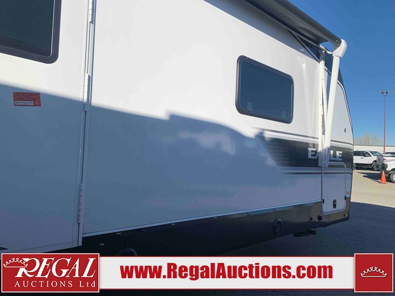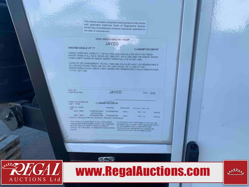 This RV is a 2025 Jayco Eagle HT 294 CKBS model tandem axle bumper pull trailer. It has a single door entry, roof air, and a single slide out accommodating the living room/kitchen area. The interior is dirty. The wood paneling has minor scuffs and scratches. The living area cushions are stained. The exterior walls are made out of hard wall fiberglass. All walls are showing minor chips, scratches and scuffs. This unit gets power with external power applied. The battery is dead. The kitchenette slide out does not fully extend. This unit is equipped with two propane tanks and two batteries. All tires are mounted on alloy rims, the tires have plenty of thread remaining. The layout of this unit consist of a master bedroom, bathroom with a washing machine at the front, and a kitchen/dining area at the center and a living room at the rear. This unit is equipped with a three burner stove top, oven, microwave, stereo system, and a television.