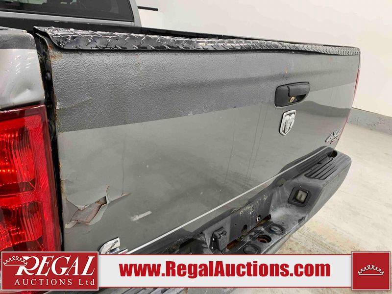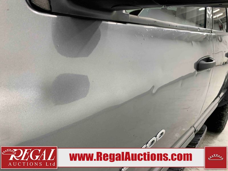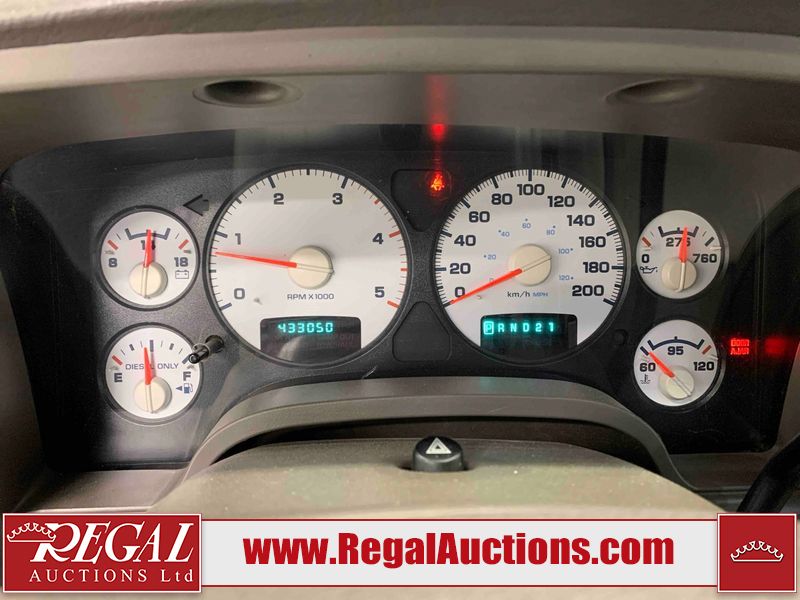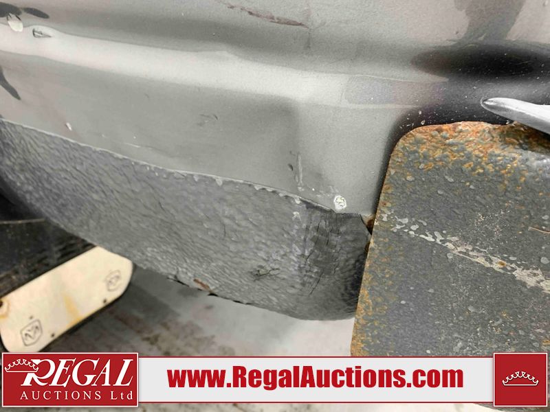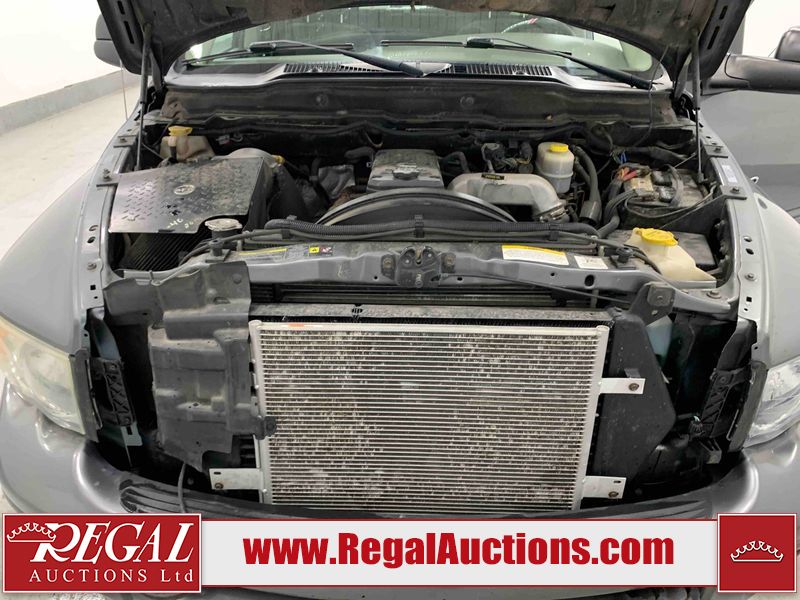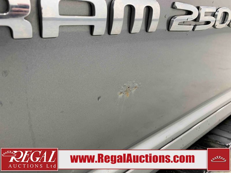 This 2005 DODGE RAM 2500 SLT QUAD CAB SWB 4WD 5.9L is powered by a turbocharged 6 cylinder diesel engine and an automatic transmission. It is equipped with four wheel drive. The truck has seats for 6 people. The truck has high mileage for its age. The vehicle has high value options including power seats. The catalytic converter is missing. The body looks to be in rough condition overall. There is considerable hail on the hood, roof, left front fender, left front door, left rear door, and left rear fender. The left front fender, rear bumper, tail gate, right rear fender, right rear door, right front door, and right front fender have been repainted poorly. There is some rust on the left front door and tail gate. There are incidental chips on the front bumper. There are scratches on the front bumper, left rear door, left rear fender, tail gate, right rear fender, right rear door, right front door, and right front fender. There is paint peeling on the left front door and left rear door. The left front door, left rear door, and left rear fender have been repainted poorly. There is slight dent damage on the left rear fender, rear bumper, tail gate, right rear fender, right rear door, and right front door. There is hail on the right front fender. There are very minor chips in many areas around the body. There are very minor scratches in some areas around the body. Aftermarket fender flairs have been mounted. The interior looks to be in good condition overall. The driver's seat is worn. The windshield is cracked. The driver side mirror is broken. The front tires are nearly bald and should be replaced. The rear tires are worn. Aftermarket alloy rims have been mounted, factory alloy rims are missing.
