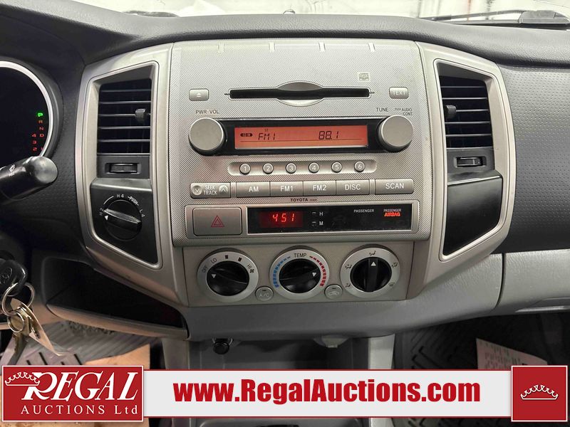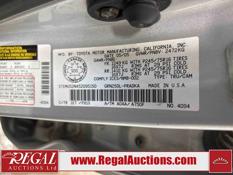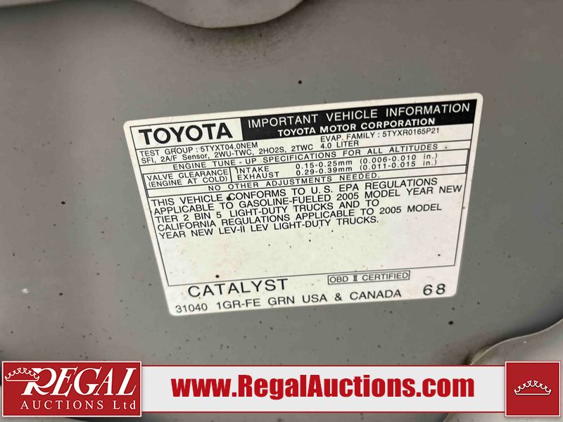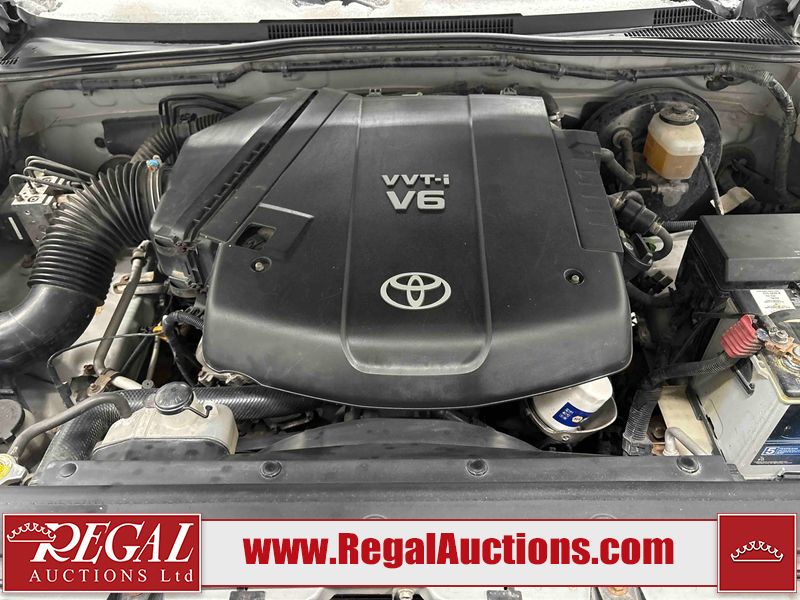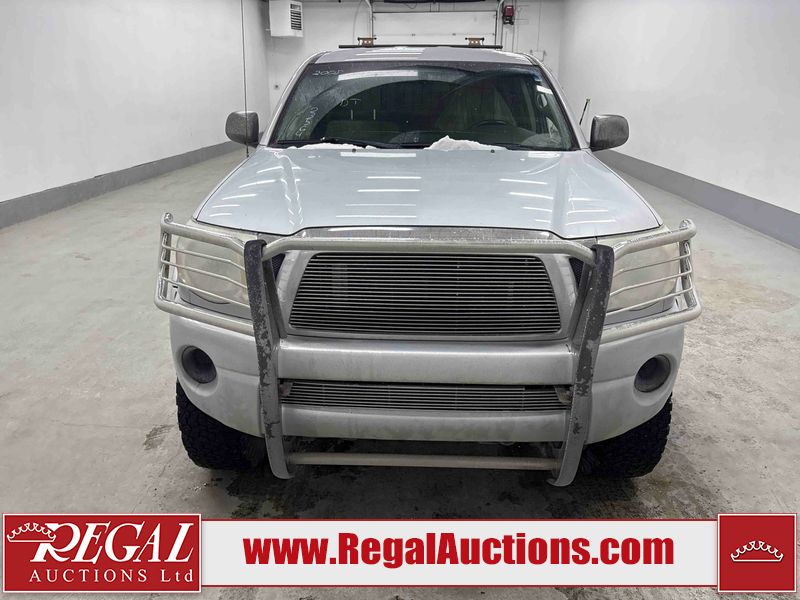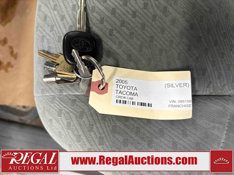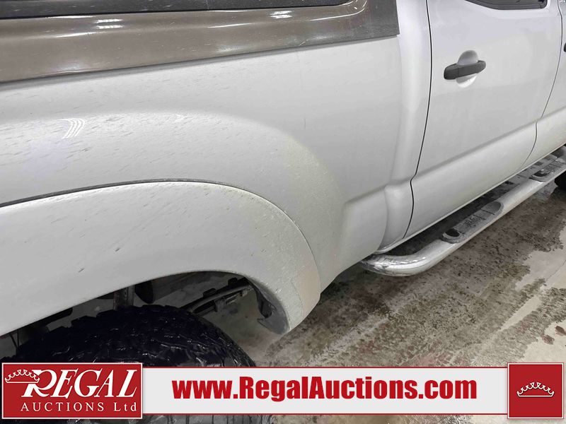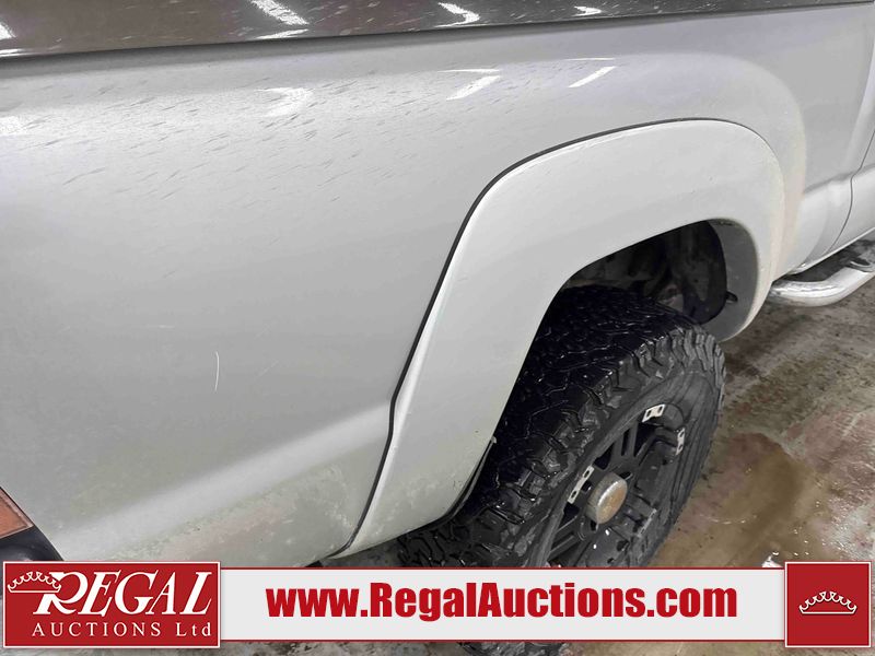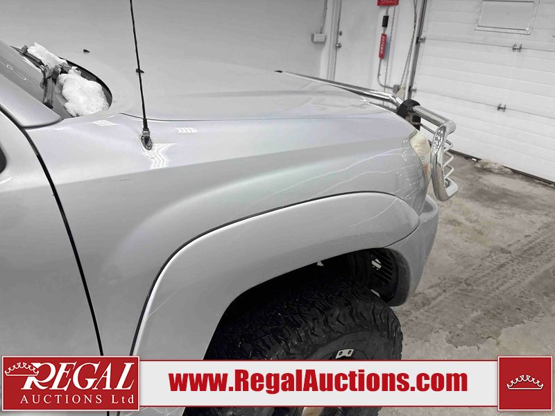 This 2005 TOYOTA TACOMA CREW CAB 4W is powered by a 4.0 liter 6 cylinder gasoline engine and an automatic transmission. It is equipped with four wheel drive. The truck has seats for 5 people. The mileage is average considering the truck's age. The body looks to be in fair condition overall. The tail gate is broken. There are noteworthy scratches on the left rear fender. There is rust on the hood, roof, left front door, left rear door, and rear bumper. There is slight hail on the hood and roof. There are scratches on the roof. There is minor dent damage on the rear bumper. There are scratches in many areas around the body. There are chips in many areas around the body. The interior looks to be in good condition overall. The windshield looks to be in good condition. All of the tires have lots of tread remaining. This truck is being sold by a franchise dealership. The vehicle will be sold with the following declarations: Dealership Trade-In (See Footnote 1). Footnotes: 1) This vehicle is being sold on behalf of a franchise dealership. Franchise Dealerships are automotive sales companies who are directly connected to an automotive manufacturer like Ford, Tesla, Honda, BMW, or similar. Regal Auctions Ltd. makes no guarantee or warranty, either express or implied, with respect to the data provided in this report. The information has been provided from the consignor and from sources generally believed to be reliable, however the accuracy of this information cannot be guaranteed by Regal Auctions.