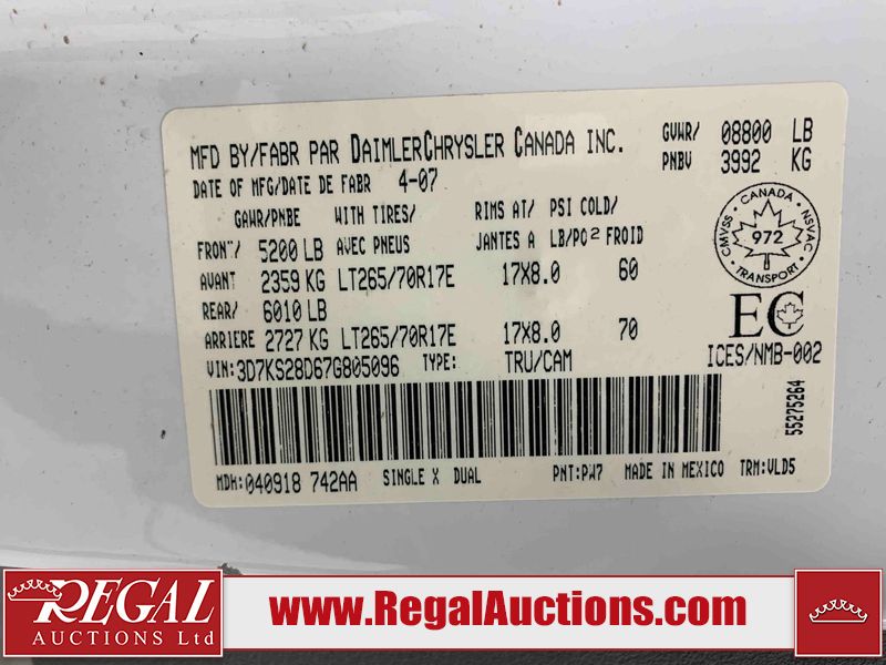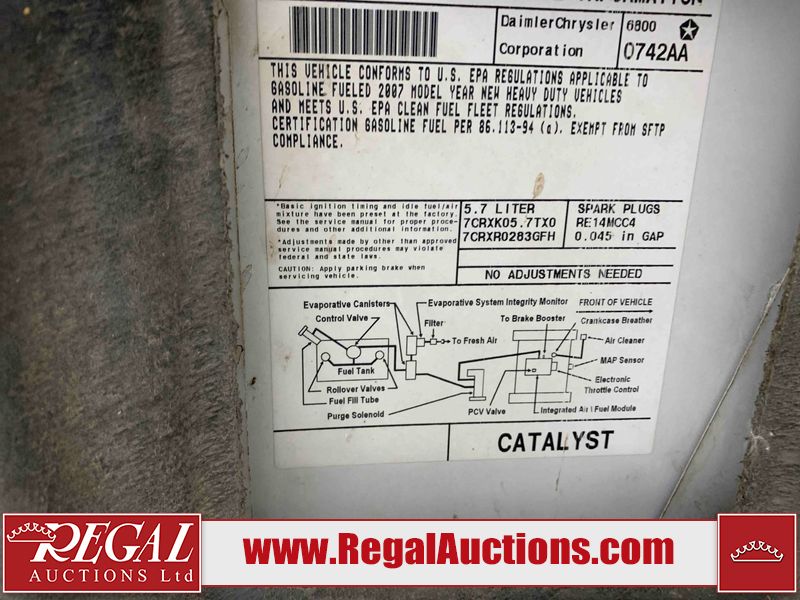 This 2007 DODGE RAM 2500 LARAMIE 4D CREW CAB PICKUP 4WD is powered by a 5.7L V8 gasoline engine and an automatic transmission. It is equipped with four-wheel drive. The truck has seats for 6 people. The truck has high mileage for its age. LARAMIE is a very popular trim level. The vehicle has high-value options including leather upholstery and power seats. The vehicle has some mechanical problems. The battery is dead. The vehicle requires a boost to start and may require a booster pack in order to stay running. The engine is making abnormal noise. (See Footnote 1) The body looks to be in rough condition overall. There are pronounced chips on the front bumper. There is noteworthy dent damage on the front bumper and pickup bed. There is pronounced rust on the front bumper, left front door, left rear door, tail gate, pickup bed, and right rear door. The fascia is broken on the front bumper. There is moderate chrome peeling on the grille. There are minor scratches on the front bumper and rear bumper. There is slight rust on the hood, roof, left front fender, left rear fender, right rear fender, right front door, and right front fender. There are chips on the hood, left front fender, left front door, left rear door, left rear fender, right rear fender, and right front fender. There is dent damage on the hood, tail gate, and right rear fender. There are very minor scratches in many areas around the body. There are very minor chips in a few areas around the body. The interior looks to be in good condition overall. The driver's seat is worn. The windshield looks to be in good condition. All of the tires have lots of tread remaining. This truck is being sold by a private individual. The vehicle will be sold with the following declarations: Mechanical Problems (See Footnote 1). Footnotes: 1) We've identified some mechanical problems with the vehicle. However, the vehicle has not undergone a mechanical inspection and our findings are not to be considered a complete evaluation of the vehicle's mechanical condition. Review our Buyer Protection Policy to see how Regal Auctions protects you from undisclosed mechanical problems. Regal Auctions Ltd. makes no guarantee or warranty, either express or implied, with respect to the data provided in this report. The information has been provided from the consignor and from sources generally believed to be reliable, however the accuracy of this information cannot be guaranteed by Regal Auctions.