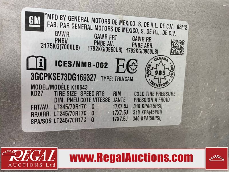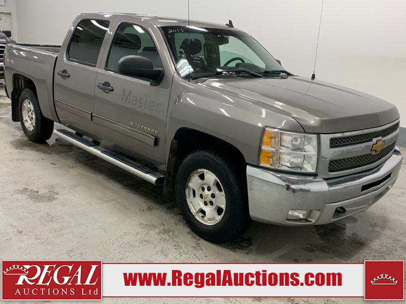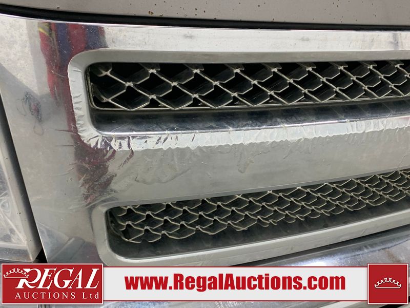 This 2013 CHEVROLET SILVERADO 1500 CREW CAB is powered by a 5.3L V8 gasoline engine and an automatic transmission. It is equipped with four-wheel drive. The truck has seats for 6 people. The truck has high mileage for its age. The body looks to be in rough condition overall. There is some hail on the hood. There are some scratches on the left rear fender, pickup bed, and right rear fender. There are incidental scratches on the front bumper, left front fender, left front door, left rear door, rear bumper, tail gate, right rear door, right front door, and right front fender. There is slight chrome peeling on the grille. There are chips on the hood, left front fender, and right front fender. There is incidental dent damage on the hood, left rear fender, pickup bed, and right rear fender. There is very minor dent damage on the left front door. There are very minor chips on the left rear door. The interior looks to be in good condition overall. The roofliner is dirty. The windshield is cracked. All of the tires have lots of tread remaining. This truck is being sold by the fleet department of a corporation or government body. The vehicle will be sold with the following declarations: Fleet Vehicle (See Footnote 1) and Hail Damage (See Footnote 2). Footnotes: 1) This vehicle is a commercially owned work vehicle. 2) This vehicle shows signs of damage from a hail storm. Hail damage is not always clearly visible in photographs. Regal Auctions Ltd. makes no guarantee or warranty, either express or implied, with respect to the data provided in this report. The information has been provided from the consignor and from sources generally believed to be reliable, however the accuracy of this information cannot be guaranteed by Regal Auctions.