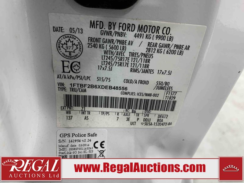 This 2013 FORD F-250 XL REG CAB 4WD is powered by a 6.2L V8 gasoline engine and an automatic transmission. It is equipped with four-wheel drive. The truck has seats for 3 people. The truck has low mileage for its age. The vehicle has high-value options including leather upholstery. The vehicle does not have power windows or power locks. The vehicle has some mechanical problems. The battery is dead. The vehicle requires a boost to start and may require a booster pack in order to stay running. (See Footnote 1) The body looks to be in fair condition overall. There is pronounced rust on the rear bumper and pickup bed. There are pronounced scratches on the pickup bed. There are chips on the front bumper and hood. There are slight scratches on the front bumper, left rear fender, and right rear fender. There is slight rust on the front bumper and roof. There is minor hail on the hood. There is incidental dent damage on the rear bumper. There are very minor scratches in some areas around the body. There are very minor chips in many areas around the body. The interior looks to be in good condition overall. The windshield looks to be in good condition. All of the tires have lots of tread remaining. This truck is being sold by the fleet department of a corporation or government body. The vehicle will be sold with the following declarations: Fleet Vehicle (See Footnote 2) and Hail Damage (See Footnote 3). Footnotes: 1) We've identified some mechanical problems with the vehicle. However, the vehicle has not undergone a mechanical inspection and our findings are not to be considered a complete evaluation of the vehicle's mechanical condition. Review our Buyer Protection Policy to see how Regal Auctions protects you from undisclosed mechanical problems. 2) This vehicle is a commercially owned work vehicle. 3) This vehicle shows signs of damage from a hail storm. Hail damage is not always clearly visible in photographs. Regal Auctions Ltd. makes no guarantee or warranty, either express or implied, with respect to the data provided in this report. The information has been provided from the consignor and from sources generally believed to be reliable, however the accuracy of this information cannot be guaranteed by Regal Auctions.