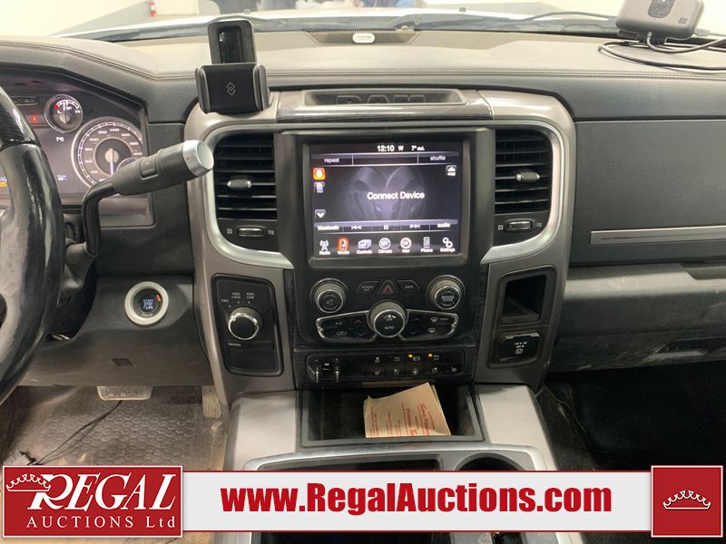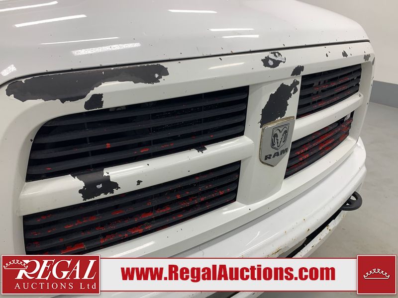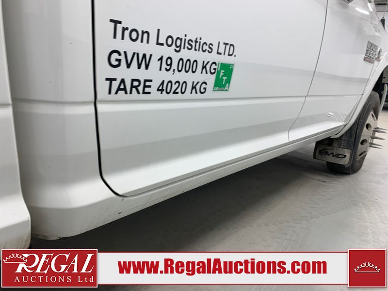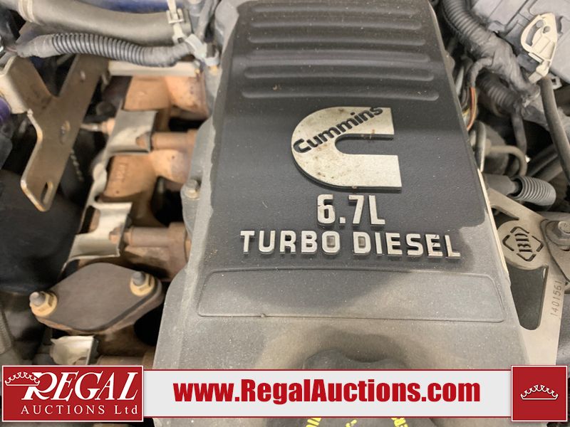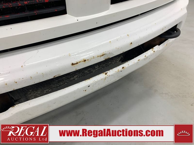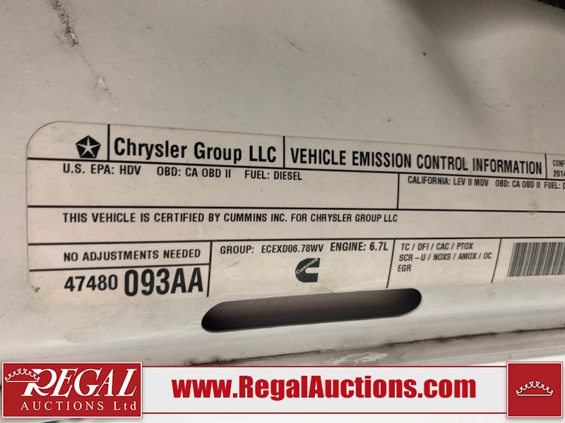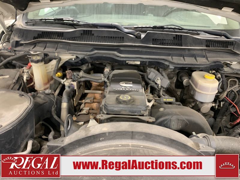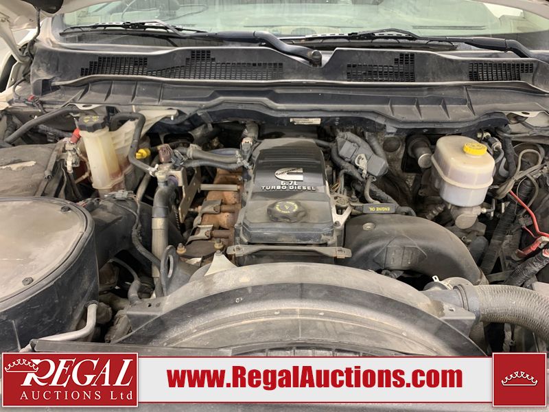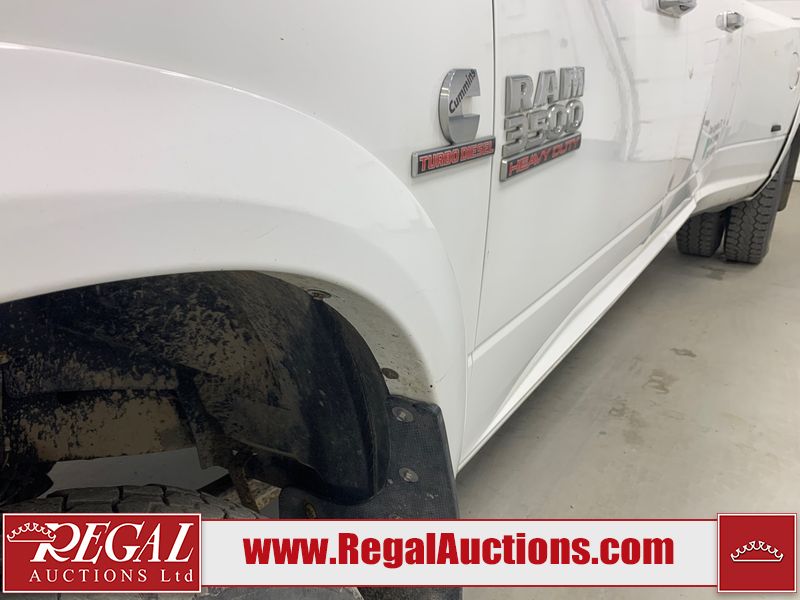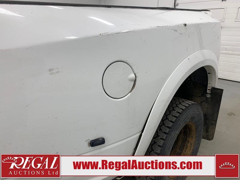 The exhaust has been modified. Four-wheel-drive is inoperable. The Check Engine light and service four-wheel-drive light are on. The hood and roof have scattered hail damage. The front bumper is showing surface rust. The west front door, left rear fender, right rear fender, and Grill have been repainted. The grille is broken and has peeling paint. There are chips across the front end and all side panels. Most panels have scratches and scuffs. There are dents on both left side doors, the tailgate, rear bumper and both right side doors. The right rear fender has been cut for the exhaust modifications. The interior is dirty, and will require a full detailing. This pick up truck is a 2014 Ram 3500 Laramie Limited crew cab long wheel base dual rear wheel four-wheel-drive model powered by a 6.7 Litre six-cylinder Cummins turbo diesel engine and an automatic transmission. It is equipped with a navigation system, powered sunroof, back up camera, front powered heated/ventilated leather seats, power windows and power door locks.