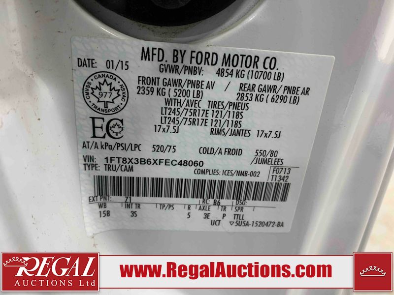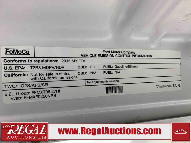 This 2015 FORD F350 S/D XLT SUPERCAB SRW 4WD is powered by a 6.2L V8 gasoline engine and an automatic transmission. It is equipped with four-wheel drive. The truck has seats for 6 people. The truck has low mileage for its age. The body looks to be in good condition overall. There are scratches on the front bumper and right rear fender. There are very minor chips in many areas around the body. There are very minor scratches in a few areas around the body. The interior looks to be in good condition overall. The windshield looks to be in good condition. All of the tires have lots of tread remaining. This truck is being sold by the fleet department of a corporation or government body. The vehicle will be sold with the following declarations: Fleet Vehicle (See Footnote 1). Footnotes: 1) This vehicle is a commercially owned work vehicle. Regal Auctions Ltd. makes no guarantee or warranty, either express or implied, with respect to the data provided in this report. The information has been provided from the consignor and from sources generally believed to be reliable, however the accuracy of this information cannot be guaranteed by Regal Auctions.