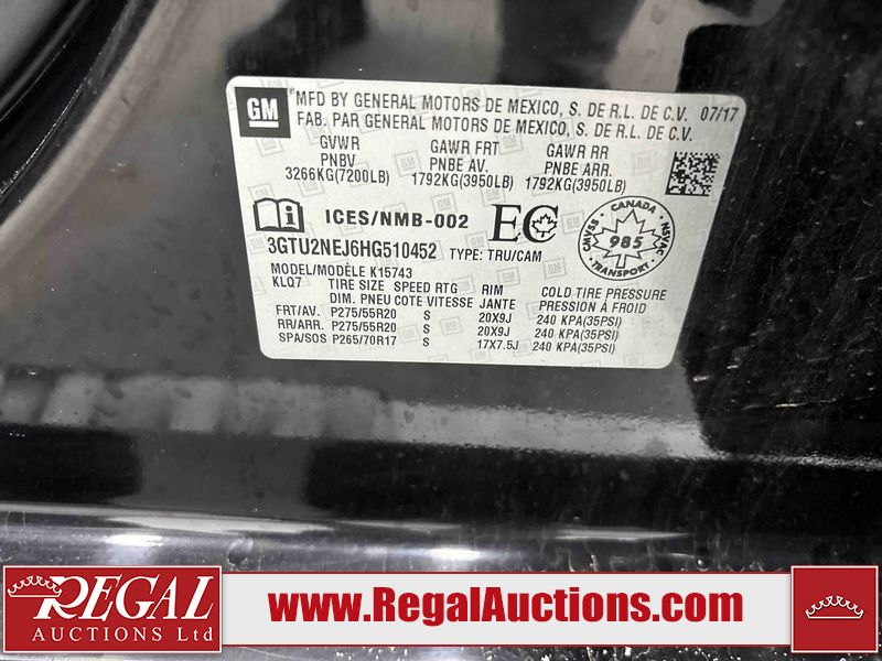 This 2017 GMC SIERRA 1500 SLT 4D CREW CAB PICKUP is powered by a 6.2L V8 gasoline engine and an automatic transmission. It is equipped with four-wheel drive. The truck has seats for 6 people. The mileage is average considering the truck's age. The vehicle has high-value options including leather upholstery, power seats, heated seats, and a backup camera. The body looks to be in good condition overall. There is incidental rust on the front bumper. There are very minor chips in many areas around the body. There are very minor scratches in many areas around the body. The interior looks to be in good condition overall. The windshield is chipped. All of the tires have lots of tread remaining. This truck is being sold by a franchise dealership. The vehicle will be sold with the following declarations: Dealership Trade-In (See Footnote 1). Footnotes: 1) This vehicle is being sold on behalf of a franchise dealership. Franchise Dealerships are automotive sales companies who are directly connected to an automotive manufacturer like Ford, Tesla, Honda, BMW, or similar. Regal Auctions Ltd. makes no guarantee or warranty, either express or implied, with respect to the data provided in this report. The information has been provided from the consignor and from sources generally believed to be reliable, however the accuracy of this information cannot be guaranteed by Regal Auctions.