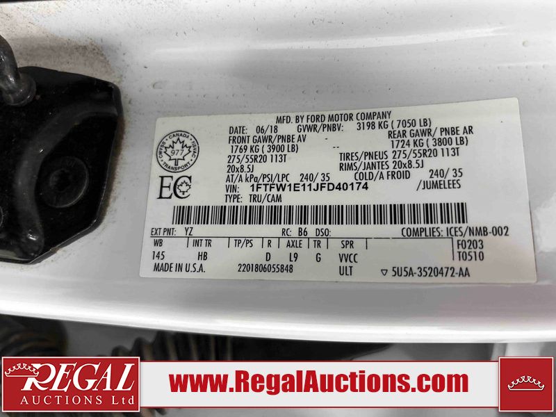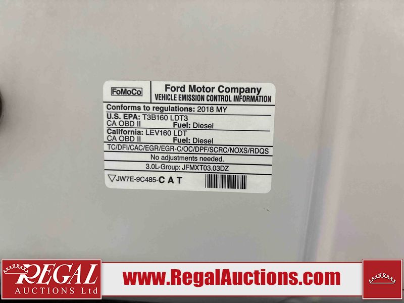 * TAILGATE INOPERABLE * This 2018 FORD F-150 CREW CAB PICKUP is powered by a 3.0 liter 6-cylinder diesel engine and an automatic transmission. It is equipped with four-wheel drive. The truck has seats for 5 people. The truck has high mileage for its age. The vehicle has high-value options, including leather upholstery, power seats, heated seats, navigation, and a backup camera. The body looks to be in fair condition overall. There are slight chips on the front bumper, left front door, and left rear fender. There is rust on the front bumper. There are incidental scratches on the right rear door, right front door, and right front fender. There is dent damage on the right rear door and right front door. There are scratches in many areas around the body. There is dent damage in a few areas around the body. There are chips in many areas around the body. The interior looks to be in good condition overall. The windshield looks to be in good condition. All of the tires have lots of tread remaining. This truck is being sold by a franchise dealership. The vehicle will be sold with the following declarations: Dealership Trade-In (See Footnote 1). Footnotes: 1) This vehicle is being sold on behalf of a franchise dealership. Franchise Dealerships are automotive sales companies who are directly connected to an automotive manufacturer like Ford, Tesla, Honda, BMW, or similar. Regal Auctions Ltd. makes no guarantee or warranty, either express or implied, with respect to the data provided in this report. The information has been provided from the consignor and from sources generally believed to be reliable, however the accuracy of this information cannot be guaranteed by Regal Auctions.