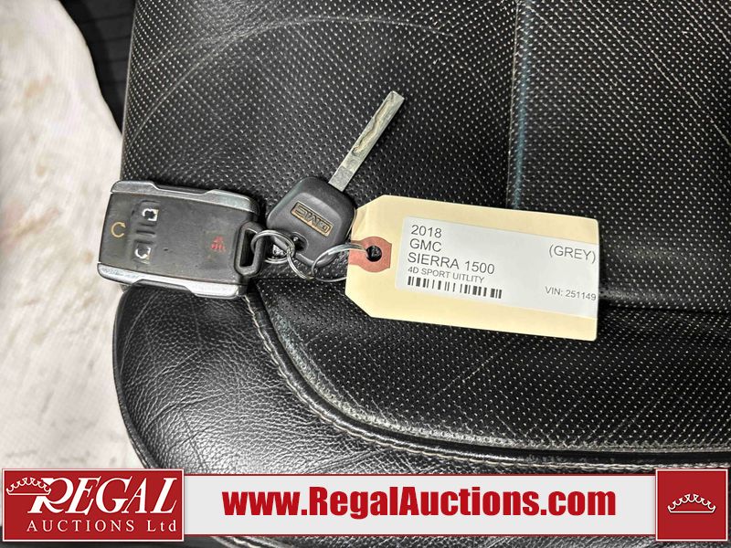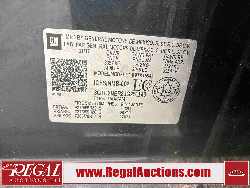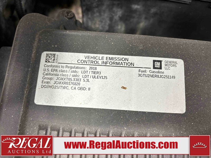 This 2018 GMC SIERRA 1500 SLT CREW CAB is powered by a 5.3L V8 gasoline engine and an automatic transmission. It is equipped with four-wheel drive. The truck has seats for 5 people. The truck has high mileage for its age. The vehicle has high-value options including leather upholstery, heated seats, navigation, and a backup camera. The body looks to be in good condition overall. There are chips on the hood, left front door, left rear door, left rear fender, right rear fender, and right rear door. There are scratches on the roof, left front door, left rear fender, and right rear fender. There is minor hail on the right rear door and right front fender. There are very minor chips in many areas around the body. There are very minor scratches in many areas around the body. There is very minor dent damage in a few areas around the body. The interior looks to be in good condition overall. The windshield looks to be in good condition. All of the tires have lots of tread remaining. This truck is being sold by an automotive broker. Regal Auctions Ltd. makes no guarantee or warranty, either express or implied, with respect to the data provided in this report. The information has been provided from the consignor and from sources generally believed to be reliable, however the accuracy of this information cannot be guaranteed by Regal Auctions.