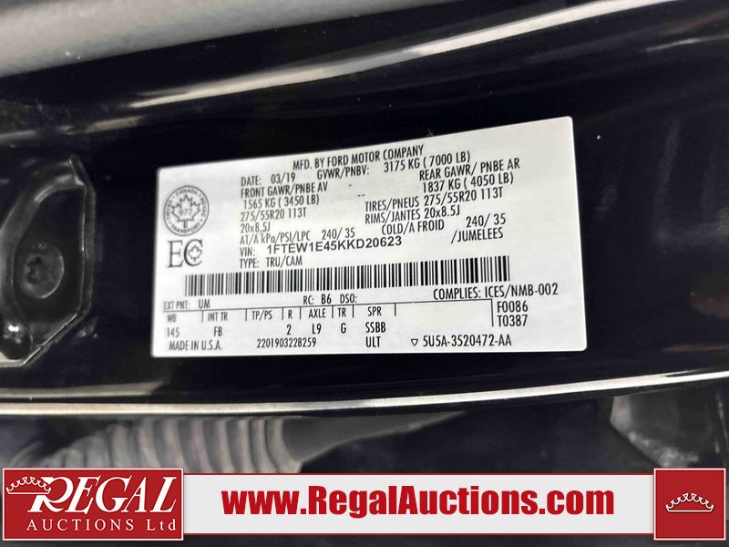 This 2019 FORD F-150 CREW CAB PICKUP is powered by a turbocharged 3.5 liter 6-cylinder gasoline engine and an automatic transmission. It is equipped with four-wheel drive. The truck has seats for 5 people. The truck has high mileage for its age. The vehicle has high-value options, including power seats, heated seats, and a backup camera. The Tire Pressure light is on. The body looks to be in fair condition overall. There is extensive hail on the hood. There is some hail on the roof. There are chips on the front bumper, hood, left front fender, left front door, left rear fender, right rear fender, and right front fender. There is incidental rust on the front bumper and rear bumper. There are incidental scratches on the left front door. There are scratches in many areas around the body. There are chips in many areas around the body. There is dent damage on the rear bumper. The taillights are broken. The interior looks to be in good condition overall. The windshield is cracked. All of the tires have lots of tread remaining. This truck is being sold by a franchise dealership. The vehicle will be sold with the following declarations: Dealership Trade-In (See Footnote 1) and Hail Damage (See Footnote 2). Footnotes: 1) This vehicle is being sold on behalf of a franchise dealership. Franchise Dealerships are automotive sales companies who are directly connected to an automotive manufacturer like Ford, Tesla, Honda, BMW, or similar. 2) This vehicle shows signs of damage from a hail storm. Hail damage is not always clearly visible in photographs. Regal Auctions Ltd. makes no guarantee or warranty, either express or implied, with respect to the data provided in this report. The information has been provided from the consignor and from sources generally believed to be reliable, however the accuracy of this information cannot be guaranteed by Regal Auctions.