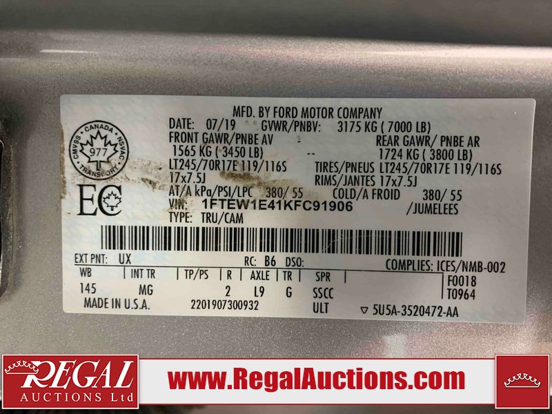 This 2019 FORD F-150 XLT 4D CREW CAB PICKUP 4WD is powered by a turbocharged 3.5L V6 gasoline engine and an automatic transmission. It is equipped with four-wheel drive. The truck has seats for 6 people. The truck has high mileage for its age. The vehicle has high-value options including power seats and a backup camera. The vehicle has some mechanical problems. The engine is making abnormal noise. (See Footnote 1) The body looks to be in fair condition overall. There are noteworthy scratches on the left rear fender and right rear fender. There are minor chips on the front bumper, grille, hood, and left front fender. There are incidental scratches on the left front door, left rear door, tailgate, and right rear door. There is very minor dent damage on the hood. There are very minor scratches in a few areas around the body. There are very minor chips on the right front fender. The taillights are broken. The interior looks to be in good condition overall. There are slight stains on the driver's seat. The windshield looks to be in good condition. The driver's side rear tire is worn. All of the other tires have lots of tread remaining. This truck is being sold by a franchise dealership. The vehicle will be sold with the following declarations: Dealership Trade-In (See Footnote 2) and Mechanical Problems (See Footnote 1). Footnotes: 1) We've identified some mechanical problems with the vehicle. However, the vehicle has not undergone a mechanical inspection and our findings are not to be considered a complete evaluation of the vehicle's mechanical condition. Review our Buyer Protection Policy to see how Regal Auctions protects you from undisclosed mechanical problems. 2) This vehicle is being sold on behalf of a franchise dealership. Franchise Dealerships are automotive sales companies who are directly connected to an automotive manufacturer like Ford, Tesla, Honda, BMW, or similar. Regal Auctions Ltd. makes no guarantee or warranty, either express or implied, with respect to the data provided in this report. The information has been provided from the consignor and from sources generally believed to be reliable, however the accuracy of this information cannot be guaranteed by Regal Auctions.