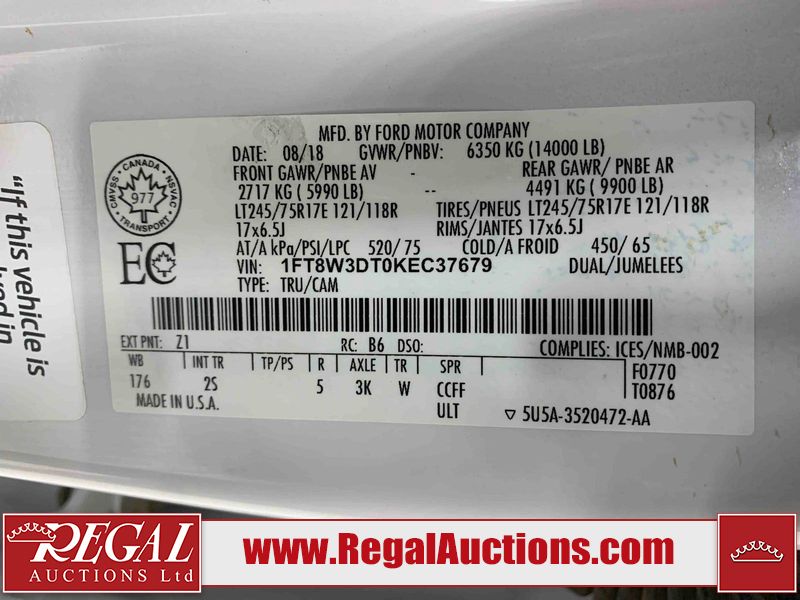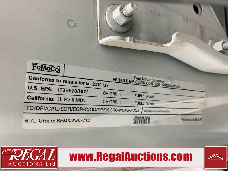 *DRIVER POWER SEAT INOPERABLE* This 2019 FORD F350 S/D XLT CREW CAB 4WD is powered by a turbocharged 6.7L V8 diesel engine and an automatic transmission. It is equipped with four-wheel drive. The truck has seats for 5 people. The truck has high mileage for its age. The vehicle has high-value options including power seats and heated seats. The body looks to be in good condition overall. There is slight rust on the front bumper. There are chips on the left rear fender and right rear fender. There are scratches on the left rear fender, pickup bed, and right rear fender. There are very minor chips in many areas around the body. There are very minor scratches in a few areas around the body. There are scratches on the grille. The interior looks to be in good condition overall. The windshield looks to be in good condition. All of the tires have lots of tread remaining. This truck is being sold by an automotive broker. Regal Auctions Ltd. makes no guarantee or warranty, either express or implied, with respect to the data provided in this report. The information has been provided from the consignor and from sources generally believed to be reliable, however the accuracy of this information cannot be guaranteed by Regal Auctions.