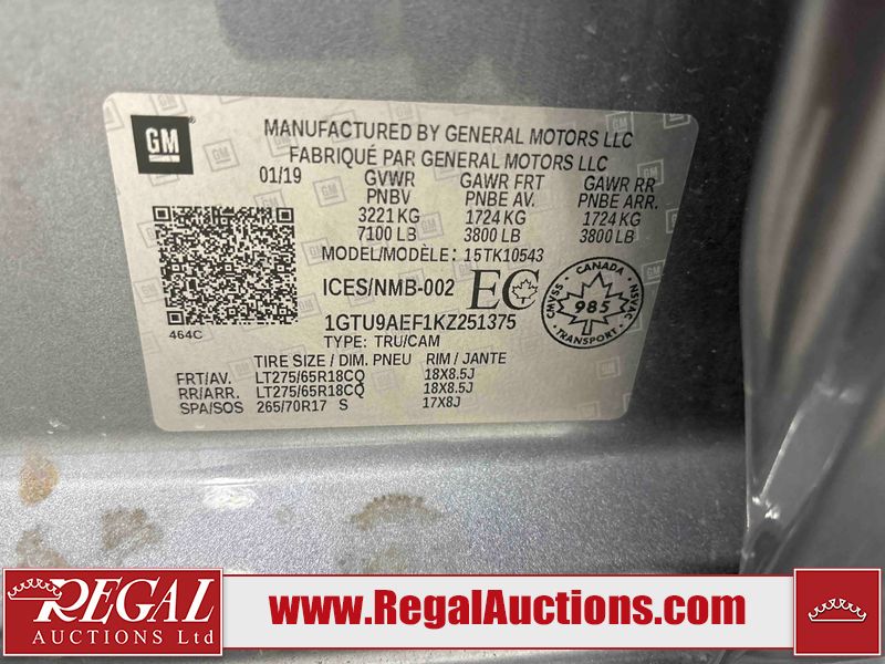 This 2019 GMC SIERRA 1500 CREW CAB 4WD is powered by a 5.3 litre 8 cylinder gasoline engine and an automatic transmission. It is equipped with four wheel drive. The truck has seats for 6 people. The mileage is average considering the truck's age. The vehicle has high value options including a backup camera. The body looks to be in good condition overall. There are scratches on the left rear fender and rear bumper. There is incidental rust on the right rear fender. There are chips in many areas around the body. There are scratches in many areas around the body. The interior looks to be in good condition overall. The windshield is chipped. All of the tires have lots of tread remaining. This truck is being sold by a franchise dealership. The vehicle will be sold with the following declarations: Claims Total $3000 - $4999 (See Footnote 1) and Dealership Trade-In (See Footnote 2). Footnotes: 1) The vehicle's total recorded insurance claims history is between $3,000 - $4,999. This is the amount of money that was paid out by an insurance company for repairs to cover claims against the vehicle's insurance policy. This information is provided by CarFax. 2) This vehicle is being sold on behalf of a franchise dealership. Franchise Dealerships are automotive sales companies who are directly connected to an automotive manufacturer like Ford, Tesla, Honda, BMW, or similar. Regal Auctions Ltd. makes no guarantee or warranty, either express or implied, with respect to the data provided in this report. The information has been provided from the consignor and from sources generally believed to be reliable, however the accuracy of this information cannot be guaranteed by Regal Auctions.