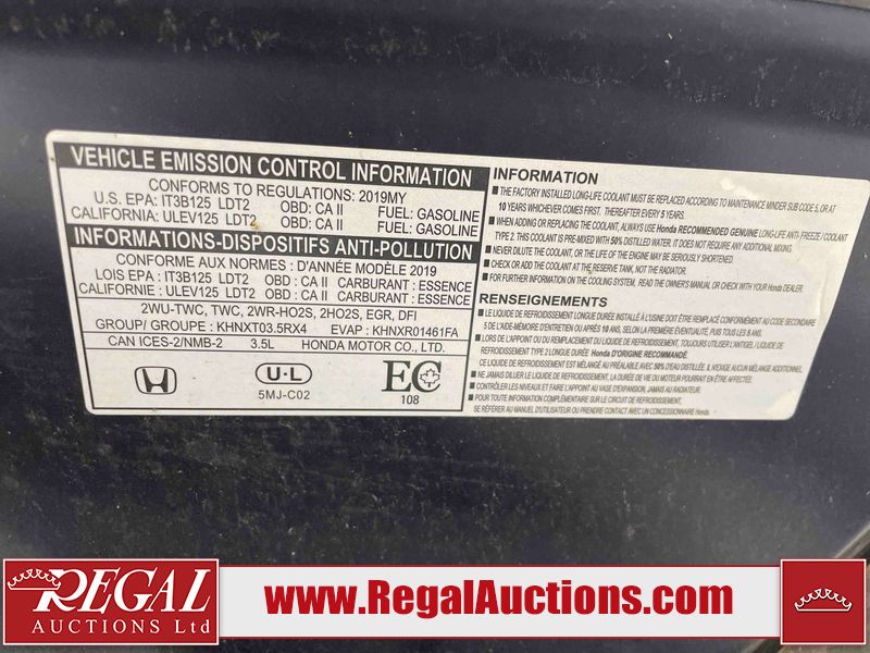 This 2019 HONDA RIDGELINE RTL CREW CAB PICKUP AWD is powered by a 3.5L V6 gasoline engine and an automatic transmission. It is equipped with all-wheel drive. The truck has seats for 5 people. The truck has high mileage for its age. The vehicle has high-value options including leather upholstery, power seats, heated seats, and a backup camera. The Tire Pressure light is on. The body looks to be in fair condition overall. The grille is cracked. There are scratches on the left front door and rear bumper. There is minimal dent damage on the left front door and left rear fender. The left rear door has parts missing. There is rust on the left rear fender and right front fender. There are very minor chips in many areas around the body. There are very minor scratches in many areas around the body. There is very minor dent damage in some areas around the body. The fog lights are broken. The interior looks to be in fair condition overall. The driver's seat, passenger seat, and rear seats are worn. The carpet is dirty. The windshield is damaged. The tires are all worn. This truck is being sold by a franchise dealership. The vehicle will be sold with the following declarations: Claims Total $1000 - $2999 (See Footnote 1) and Dealership Trade-In (See Footnote 2). Footnotes: 1) The vehicle's total recorded insurance claims history is between $1,000 - $2,999. This is the amount of money that was paid out by an insurance company for repairs to cover claims against the vehicle's insurance policy. This information is provided by CarFax. 2) This vehicle is being sold on behalf of a franchise dealership. Franchise Dealerships are automotive sales companies who are directly connected to an automotive manufacturer like Ford, Tesla, Honda, BMW, or similar. Regal Auctions Ltd. makes no guarantee or warranty, either express or implied, with respect to the data provided in this report. The information has been provided from the consignor and from sources generally believed to be reliable, however the accuracy of this information cannot be guaranteed by Regal Auctions.
