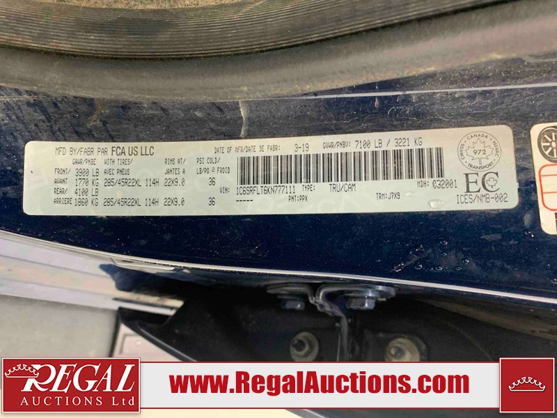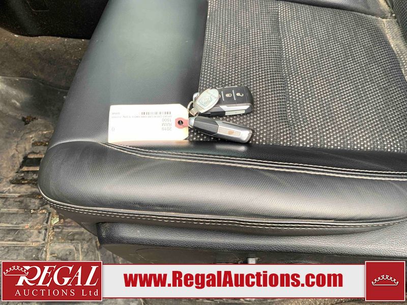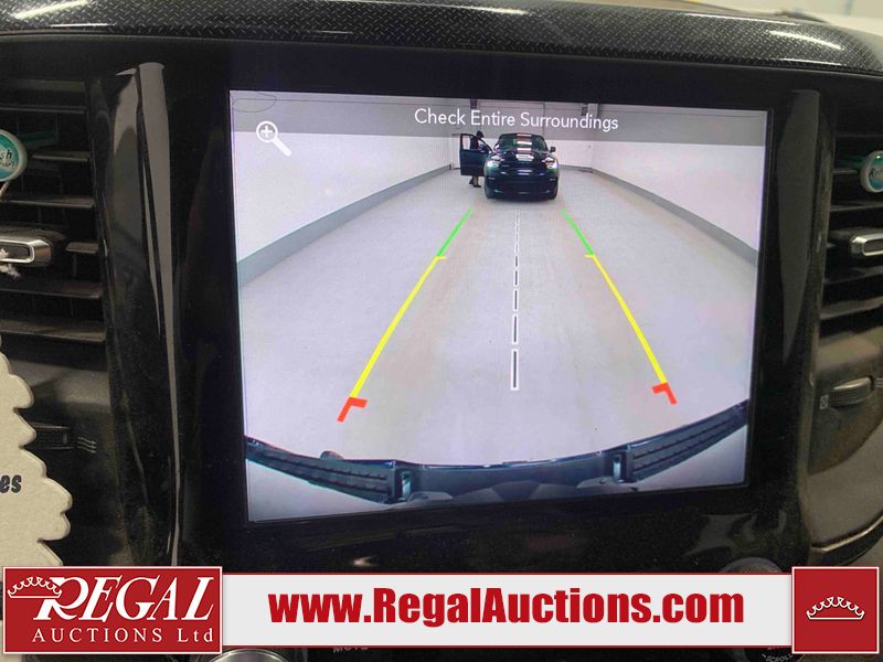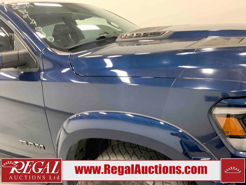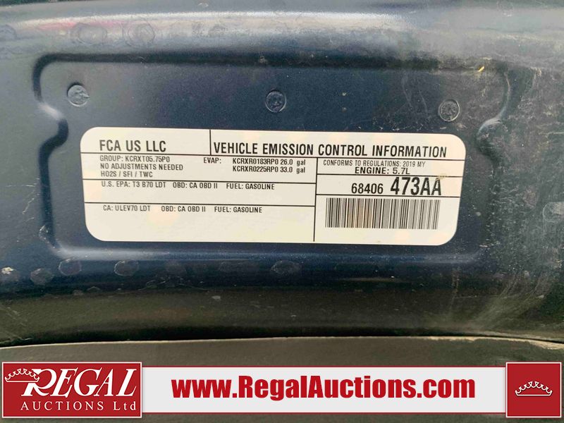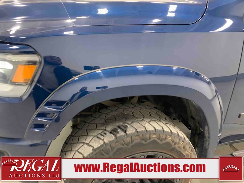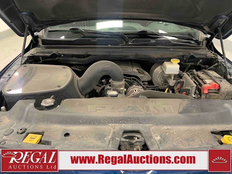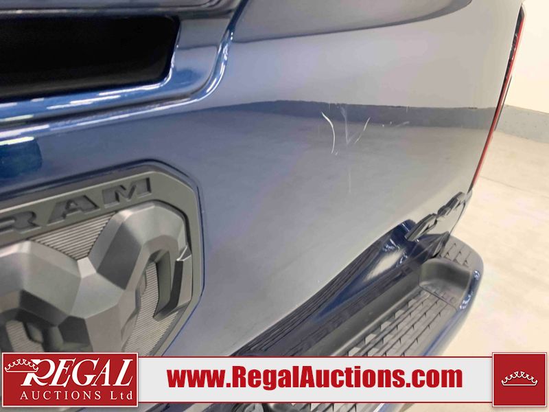 This 2019 RAM 1500 SPORT CREW CAB SWB 4WD 5.7L is powered by a 8 cylinder gasoline engine and an automatic transmission. It is equipped with four wheel drive. The truck has seats for 5 people. The mileage is average considering the truck's age. The vehicle has high value options including leather upholstery, power seats, heated seats, navigation, and a backup camera. The Check Engine light is on. The vehicle has some mechanical problems. The engine has a top end tick. Aftermarket exhaust tips have been installed. Aftermarket master air filter has been installed. The body looks to be in rough condition overall. The left rear door has been repainted poorly. There is considerable dent damage on the rear bumper. There is a fair amount of hail on the hood and roof. There are chips on the front bumper, grille, hood, roof, rear bumper, tail gate, right rear fender, and right front door. There are minor scratches on the front bumper, rear bumper, tail gate, and right rear fender. There is paint peeling on the rear bumper. There are very minor scratches in many areas around the body. There are very minor chips in many areas around the body. There is very minor dent damage on the left rear fender. The interior looks to be in rough condition overall. The passenger seat, rear seats, and doors are stained. The dashboard, driver's seat, passenger seat, rear seats, and doors are dirty. The carpet is dirty. The windshield is cracked. The driver's side front tire and passenger side rear tire are both worn. The passenger side front tire and the driver's side rear tire are both nearly bald and should be replaced. Aftermarket alloy rims with tires mounted have been installed, factory rims are missing.