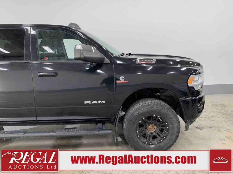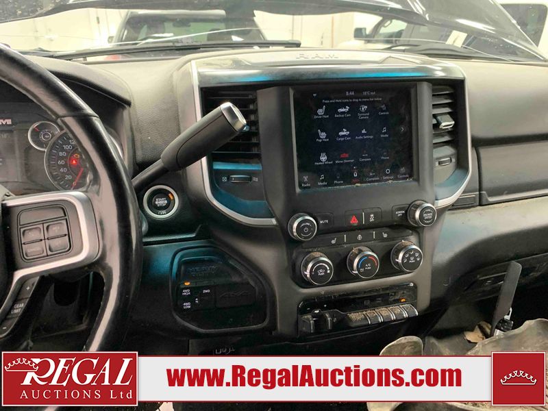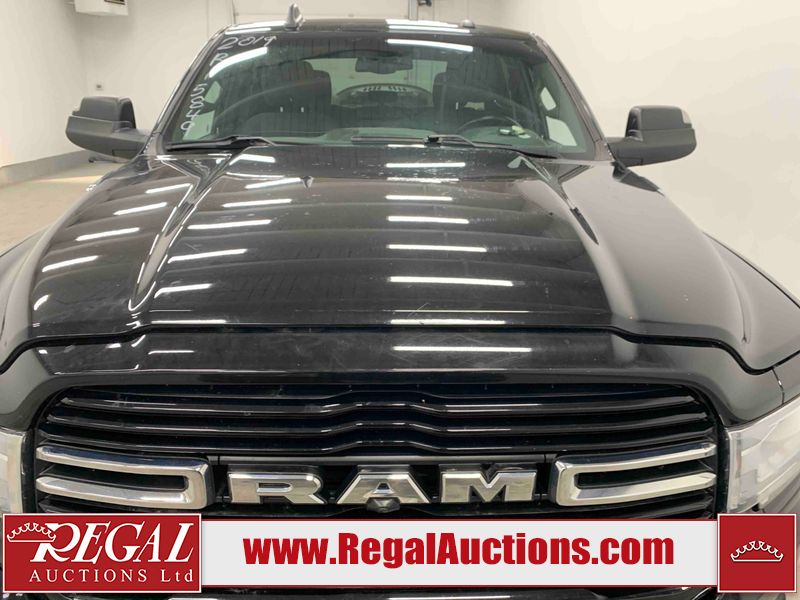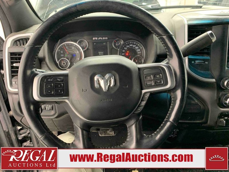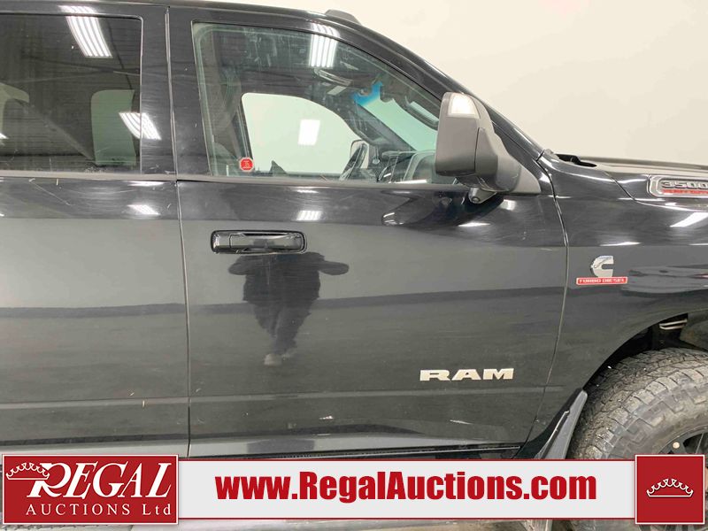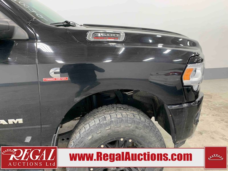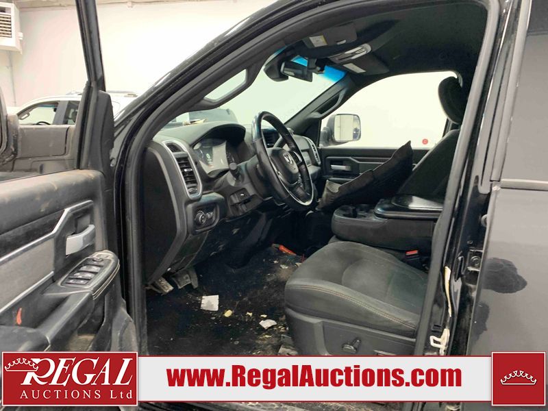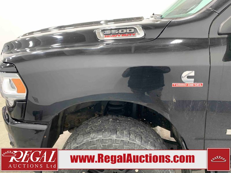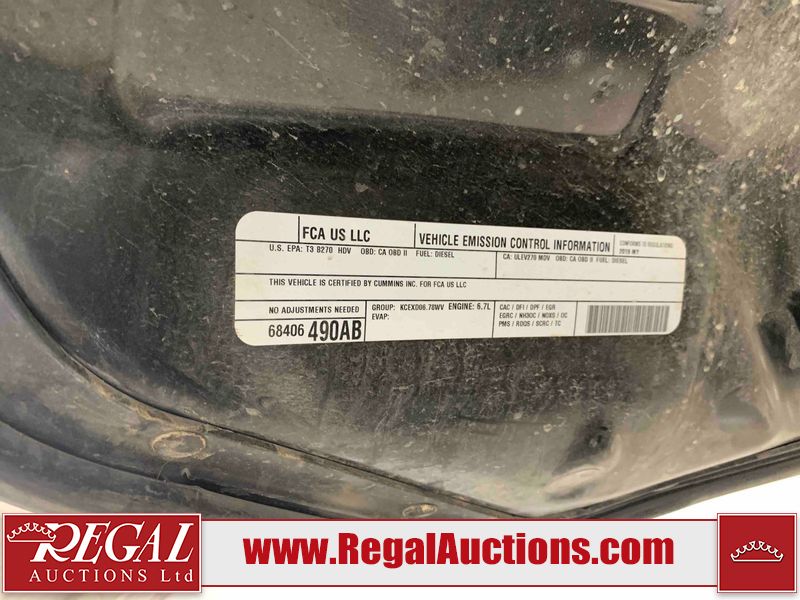 This 2019 RAM 3500 BIG HORN CREW CAB SWB 4WD 6.7L is powered by a turbocharged 8 cylinder diesel engine and an automatic transmission. It is equipped with four wheel drive. The truck has seats for 6 people. The truck has high mileage for its age. The vehicle has high value options including power seats, heated seats, navigation, and a backup camera. The Check Engine light is on. The body looks to be in fair condition overall. There are chips on the front bumper, hood, roof, left front fender, left front door, left rear door, left rear fender, rear bumper, tail gate, right rear fender, right rear door, right front door, and right front fender. There are minimal scratches on the front bumper, hood, left front fender, left front door, left rear door, left rear fender, rear bumper, tail gate, right rear fender, right rear door, right front door, and right front fender. There is very minor dent damage on the right rear fender. The interior looks to be in fair condition overall. The dashboard, driver's seat, passenger seat, rear seats, and doors are dirty. The windshield is cracked. The front tires are both worn. The rear tires both have lots of tread remaining. Aftermarket all the way rims with tires have been mounted, the factory alloys are missing.