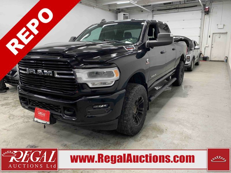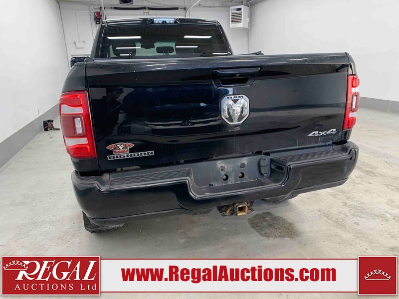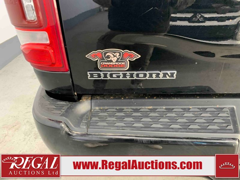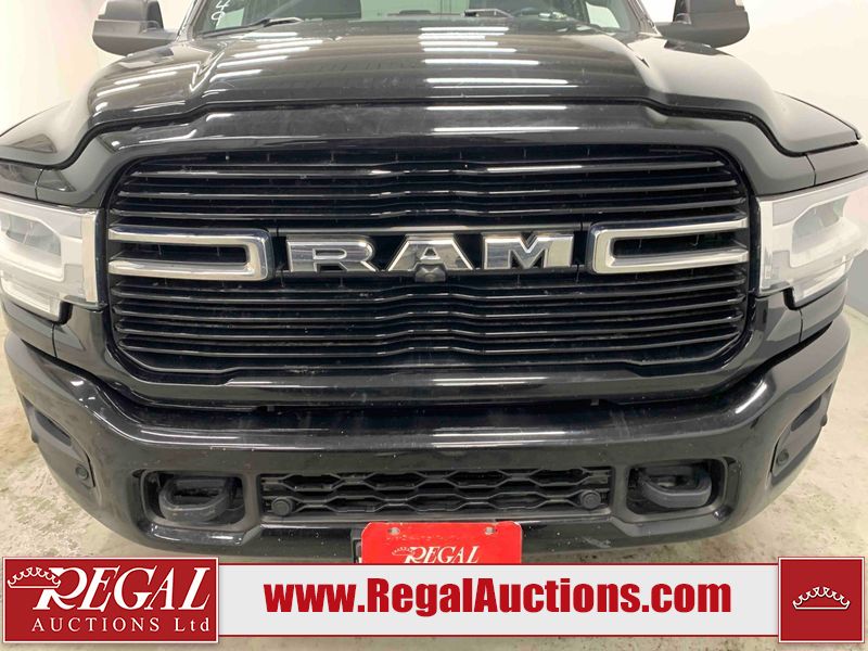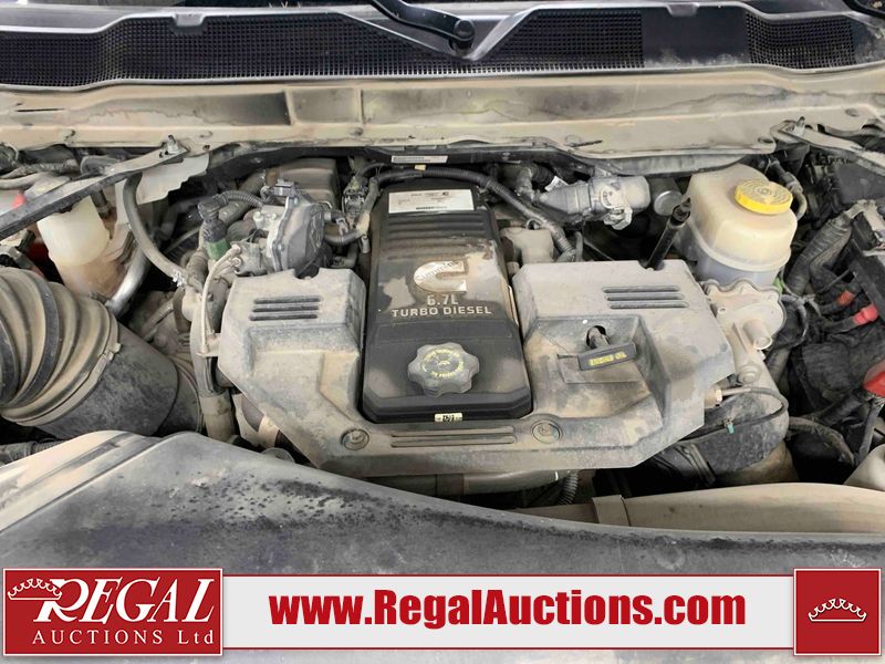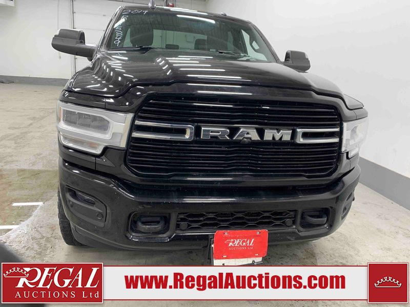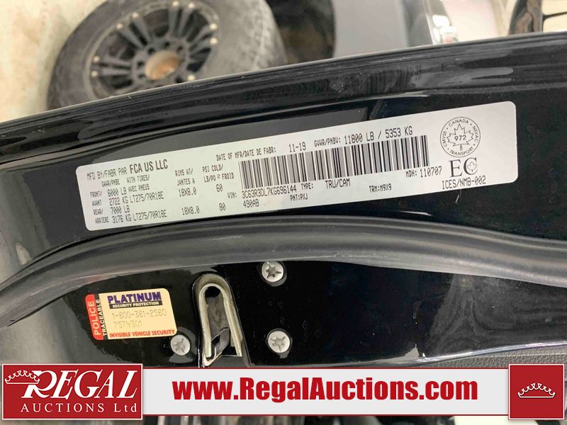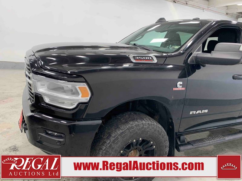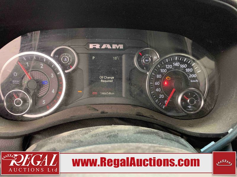 This 2019 RAM 3500 BIG HORN CREW CAB SWB 4WD 6.7L is powered by a turbocharged 8 cylinder diesel engine and an automatic transmission. It is equipped with four wheel drive. The truck has seats for 6 people. The truck has high mileage for its age. The vehicle has high value options including power seats, heated seats, navigation, and a backup camera. The Check Engine light is on. The body looks to be in fair condition overall. There are chips on the front bumper, hood, roof, left front fender, left front door, left rear door, left rear fender, rear bumper, tail gate, right rear fender, right rear door, right front door, and right front fender. There are minimal scratches on the front bumper, hood, left front fender, left front door, left rear door, left rear fender, rear bumper, tail gate, right rear fender, right rear door, right front door, and right front fender. There is very minor dent damage on the right rear fender. The interior looks to be in fair condition overall. The dashboard, driver's seat, passenger seat, rear seats, and doors are dirty. The windshield is cracked. The front tires are both worn. The rear tires both have lots of tread remaining. Aftermarket all the way rims with tires have been mounted, the factory alloys are missing.