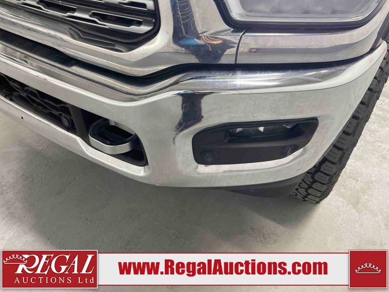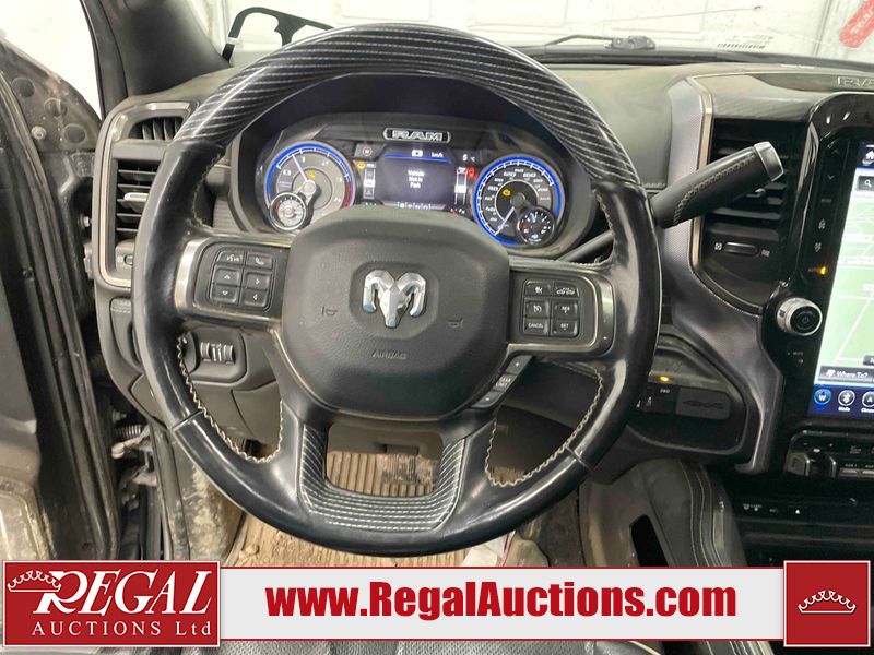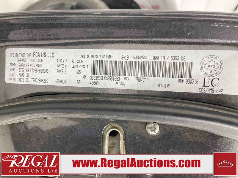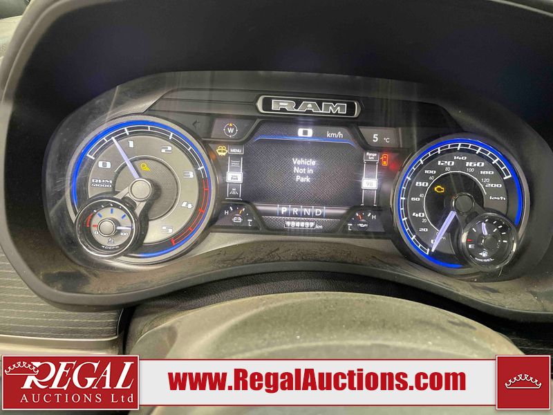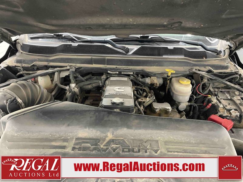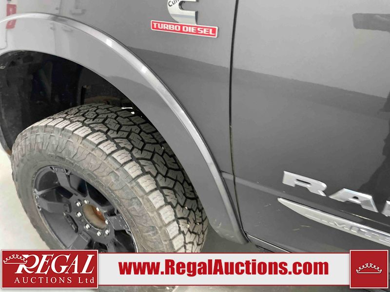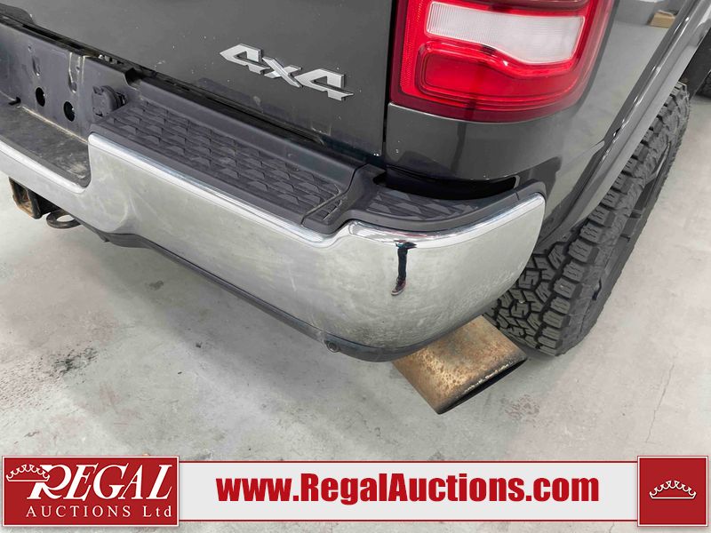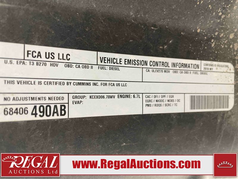 This 2019 RAM 3500 LARAMIE LIMITED CREW CAB SWB 4WD 6.7L is powered by a turbocharged 6 cylinder diesel engine and an automatic transmission. It is equipped with four wheel drive. The truck has seats for 5 people. The truck has high mileage for its age. The vehicle has high value options including leather upholstery, power seats, heated seats, navigation, and a backup camera. The Check Engine light is on. The transmission does not shift, has possible internal failure and requires replacement. Aftermarket exhaust system has been installed. The body looks to be in fair condition overall. The fascia is cracked on the front bumper. There are minor chips on the grille, hood, left rear fender, tail gate, right rear fender, right rear door, and right front door. There is minor paint peeling on the grille and left front fender. There are minimal scratches on the left rear door, left rear fender, tail gate, right rear fender, and right rear door. There are very minor chips in many areas around the body. There are very minor scratches in many areas around the body. There is very minor dent damage on the rear bumper. The interior looks to be in fair condition overall. The dashboard, driver's seat, rear seats, and doors are dirty. The carpet is dirty. The windshield is cracked. The driver side mirror is broken. All of the tires have lots of tread remaining. Aftermarket alloy rims with tires are mounted, the factory alloys are missing.