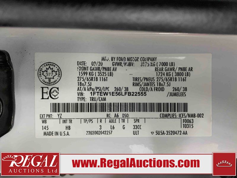 This 2020 FORD F-150 LARIAT CREW CAB is powered by a 5.0L V8 gasoline engine and an automatic transmission. It is equipped with four-wheel drive. The truck has seats for 5 people. The truck has high mileage for its age. LARIAT is a very popular trim level. The vehicle has high-value options including leather upholstery, power seats, heated seats, navigation, and a backup camera. The vehicle has some mechanical problems. The engine is making abnormal noise. (See Footnote 1) The body looks to be in good condition overall. There are a fair amount of chips on the front bumper. There is rust on the front bumper. There are chips on the grille, hood, and right rear fender. There is very minor dent damage on the hood. There are very minor chips in many areas around the body. There are very minor scratches in a few areas around the body. The interior looks to be in good condition overall. The windshield is cracked. All of the tires have lots of tread remaining. This truck is being sold by a franchise dealership. The vehicle will be sold with the following declarations: Dealership Trade-In (See Footnote 2) and Mechanical Problems (See Footnote 1). Footnotes: 1) We've identified some mechanical problems with the vehicle. However, the vehicle has not undergone a mechanical inspection and our findings are not to be considered a complete evaluation of the vehicle's mechanical condition. Review our Buyer Protection Policy to see how Regal Auctions protects you from undisclosed mechanical problems. 2) This vehicle is being sold on behalf of a franchise dealership. Franchise Dealerships are automotive sales companies who are directly connected to an automotive manufacturer like Ford, Tesla, Honda, BMW, or similar. Regal Auctions Ltd. makes no guarantee or warranty, either express or implied, with respect to the data provided in this report. The information has been provided from the consignor and from sources generally believed to be reliable, however the accuracy of this information cannot be guaranteed by Regal Auctions.