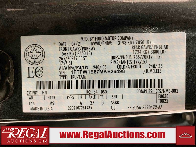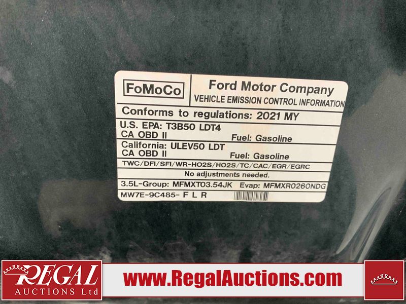 This 2021 FORD F-150 XLT CREW CAB 4WD is powered by a turbocharged 3.5L V6 gasoline engine and an automatic transmission. It is equipped with four-wheel drive. The truck has seats for 6 people. The truck has high mileage for its age. The vehicle has high-value options including power seats and a backup camera. The body looks to be in fair condition overall. The grille is cracked. There are pronounced scratches on the pickup bed. There are chips on the grille, hood, left front fender, left rear door, left rear fender, right rear fender, and right rear door. There is paint peeling on the hood. There is incidental dent damage on the left front door. There are scratches on the left front door, rear bumper, tailgate, right rear fender, right front door, and right front fender. There are very minor scratches in some areas around the body. There are very minor chips in some areas around the body. There is condensation in the signal lens. The interior looks to be in good condition overall. The windshield is cracked. All of the tires have lots of tread remaining. This truck is being sold by an automotive broker. The vehicle will be sold with the following declarations: Claims Total $15,000 - $19,999 (See Footnote 1), Out of Province - SK (See Footnote 2), and Out of Province - AB OVERRIDE (See Footnote 3). Footnotes: 1) The vehicle's total recorded insurance claims history is between $15,000 - $19,999. This is the amount of money that was paid out by an insurance company for repairs to cover claims against the vehicle's insurance policy. This information is provided by CarFax. 2) The vehicle's last registered jurisdiction is Saskatchewan. The purchaser must have the vehicle undergo and pass an Out of Province inspection before it can be registered in Alberta. 3) Out of province inspection for registering the vehicle in Alberta has been completed. Regal Auctions Ltd. makes no guarantee or warranty, either express or implied, with respect to the data provided in this report. The information has been provided from the consignor and from sources generally believed to be reliable, however the accuracy of this information cannot be guaranteed by Regal Auctions.