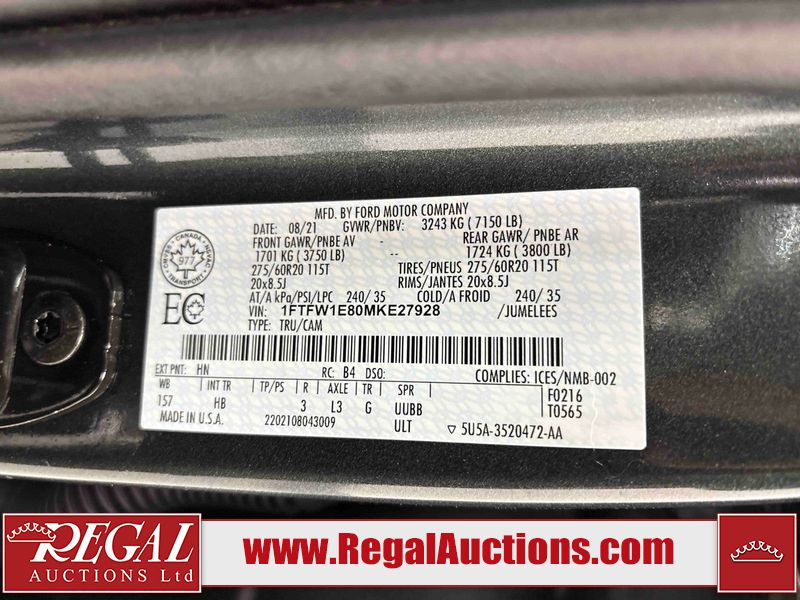 This 2021 FORD F-150 SUPERCREW 4X4 is powered by a turbocharged 3.5L V6 gasoline engine and an automatic transmission. It is equipped with four-wheel drive. The truck has seats for 5 people. The truck has high mileage for its age. The vehicle has high-value options including leather upholstery, power seats, heated seats, navigation, and a backup camera. The body looks to be in fair condition overall. There are minor chips on the hood and left front fender. There are scratches on the left front door, left rear fender, and tailgate. There are very minor chips in many areas around the body. There are very minor scratches in many areas around the body. There is very minor dent damage in a few areas around the body. The interior looks to be in good condition overall. The driver seat is torn. The windshield is chipped. All of the tires have lots of tread remaining. This truck is being sold by an automotive broker. Regal Auctions Ltd. makes no guarantee or warranty, either express or implied, with respect to the data provided in this report. The information has been provided from the consignor and from sources generally believed to be reliable, however the accuracy of this information cannot be guaranteed by Regal Auctions.