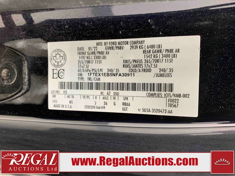 This 2022 FORD F-150 4D EXTENDED CAB PICKUP is powered by a 3.3L V6 gasoline engine and an automatic transmission. It is equipped with four-wheel drive. The truck has seats for 6 people. The truck has high mileage for its age. The vehicle has high-value options including navigation and a backup camera. The body looks to be in fair condition overall. There are slight scratches on the front bumper, hood, roof, left front fender, rear bumper, and right front fender. There are minimal chips on the front bumper, hood, roof, left front fender, rear bumper, and right front fender. There is dent damage on the right front fender. There are very minor chips in many areas around the body. There are very minor scratches in many areas around the body. The interior looks to be in fair condition overall. The rear seats are stained. The dashboard, driver's seat, passenger seat, and doors are dirty. The carpet is dirty. The windshield is chipped. The rear tires are worn. The front tires have lots of tread remaining. This truck is being sold by an automotive broker. The vehicle will be sold with the following declarations: Out of Province - BC (See Footnote 1). Footnotes: 1) The vehicle's last registered jurisdiction is British Columbia. The purchaser must have the vehicle undergo and pass an Out of Province inspection before it can be registered in Alberta. Regal Auctions Ltd. makes no guarantee or warranty, either express or implied, with respect to the data provided in this report. The information has been provided from the consignor and from sources generally believed to be reliable, however the accuracy of this information cannot be guaranteed by Regal Auctions.