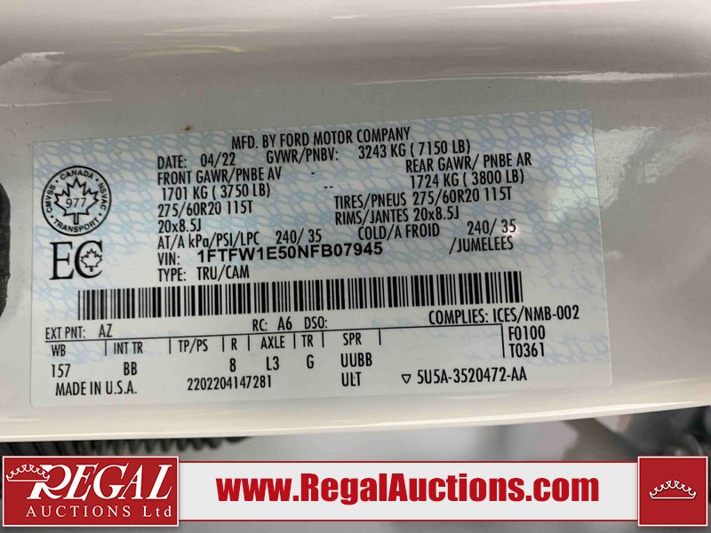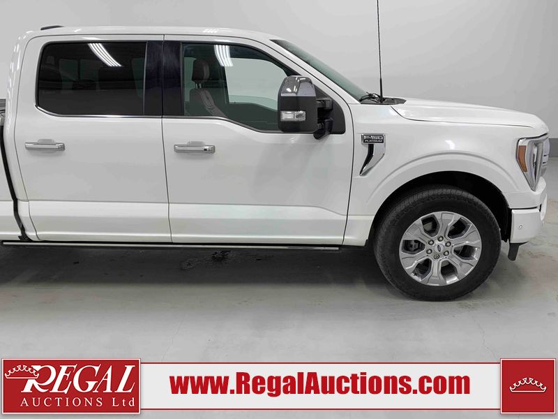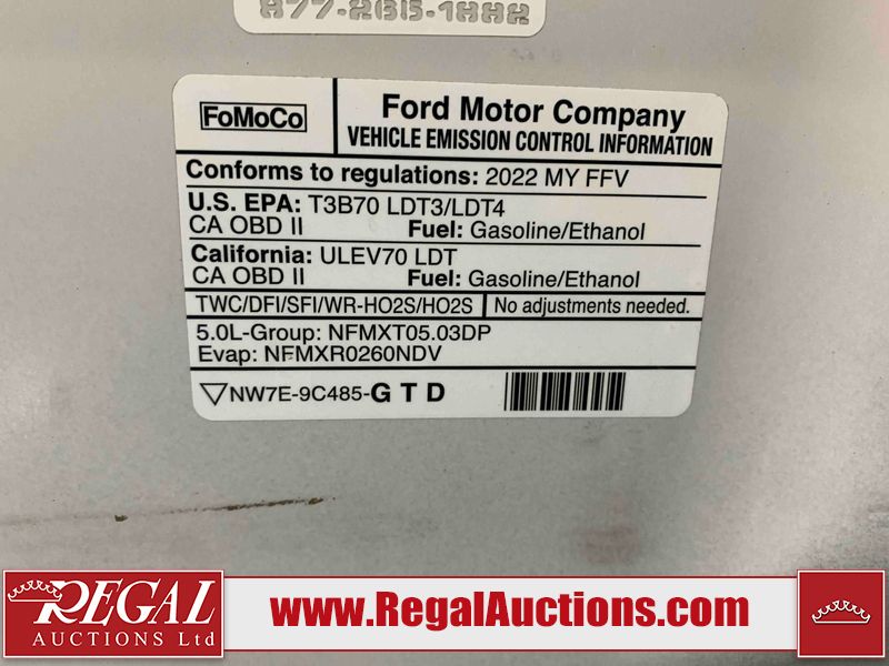 This 2022 FORD F-150 PLATINUM 4D CREW CAB 4WD is powered by a turbocharged 5.0L V8 gasoline engine and an automatic transmission. It is equipped with four-wheel drive. The truck has seats for 5 people. The truck has high mileage for its age. PLATINUM is a very popular trim level. The vehicle has high-value options including leather upholstery, power seats, heated seats, navigation, and a backup camera. The body looks to be in good condition overall. There are minor chips on the front bumper. There are very minor chips in a few areas around the body. There are very minor scratches in many areas around the body. The interior looks to be in good condition overall. The windshield is chipped. The rear tires are worn. The front tires have lots of tread remaining. This truck is being sold by a private individual. The vehicle will be sold with the following declarations: Claims Total Above $20,000 (See Footnote 1). Footnotes: 1) The vehicle's total recorded insurance claims history is above $20,000. This is the amount of money that was paid out by an insurance company for repairs to cover claims against the vehicle's insurance policy. This information is provided by CarFax. Regal Auctions Ltd. makes no guarantee or warranty, either express or implied, with respect to the data provided in this report. The information has been provided from the consignor and from sources generally believed to be reliable, however the accuracy of this information cannot be guaranteed by Regal Auctions.