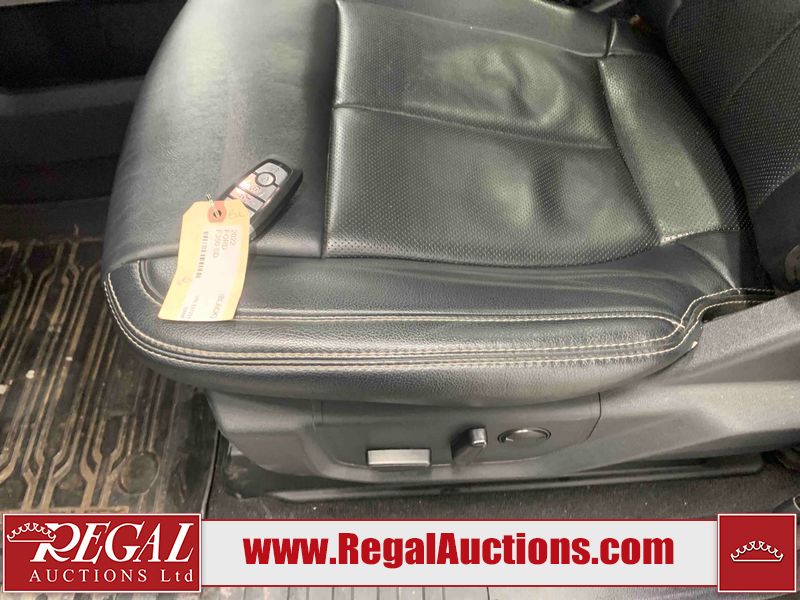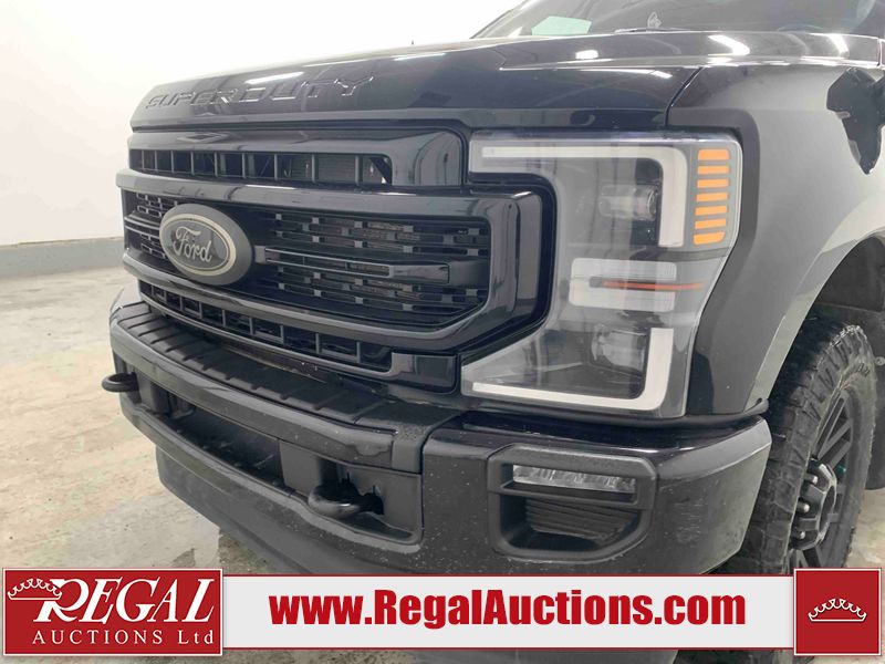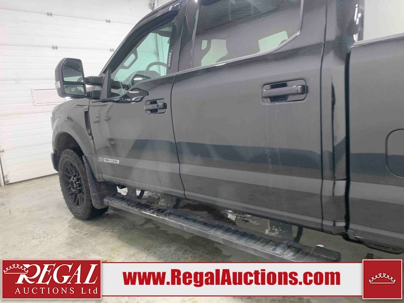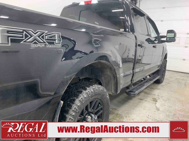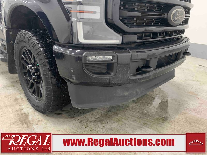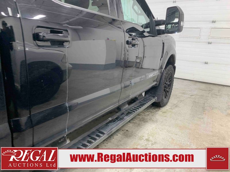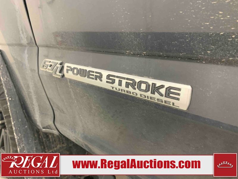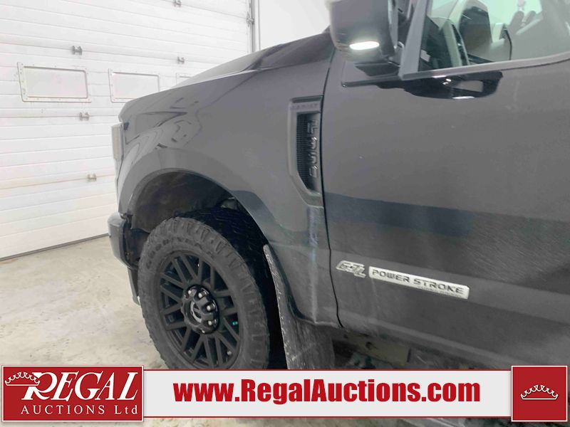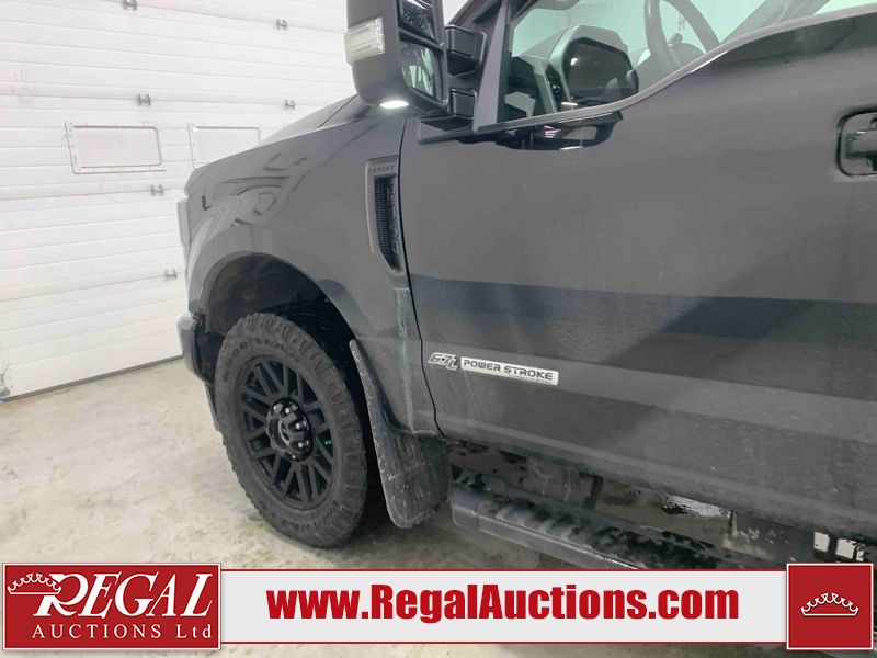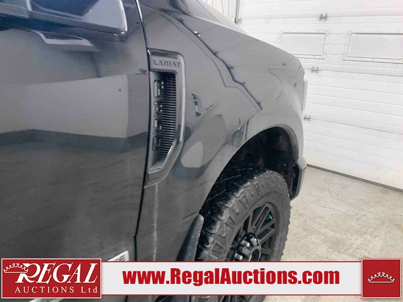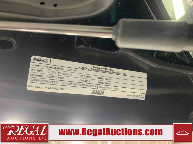This 2022 FORD SUPER DUTY LARIAT SUPER CAB SWB SRD 4WD 6.7L is powered by a turbocharged 8 cylinder diesel engine and an automatic transmission. It is equipped with four wheel drive. The truck has seats for 5 people. The mileage is average considering the truck's age. LARIAT is a very popular trim level. The vehicle has high value options including leather upholstery, power seats, heated seats, navigation, and a backup camera. The body looks to be in fair condition overall. There are conspicuous chips on the front bumper. There are incidental scratches on the front bumper, left front fender, and rear bumper. There is minor rust on the front bumper and rear bumper. There are chips on the grille, hood, left rear fender, rear bumper, and right rear fender. There are very minor scratches in many areas around the body. There are very minor chips in many areas around the body. The interior looks to be in good condition overall. The front right passenger window is cracked. The windshield is damaged. All of the tires have lots of tread remaining. Aftermarket wheels are installed. The factory set is missing.