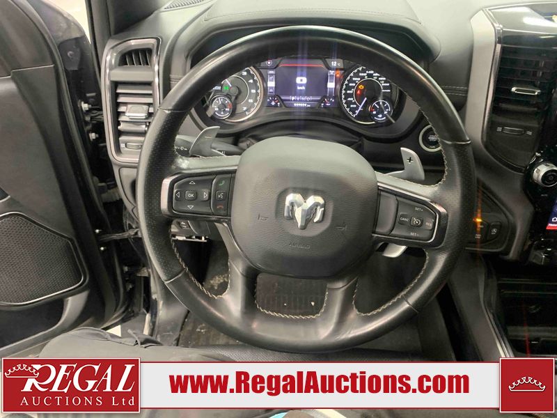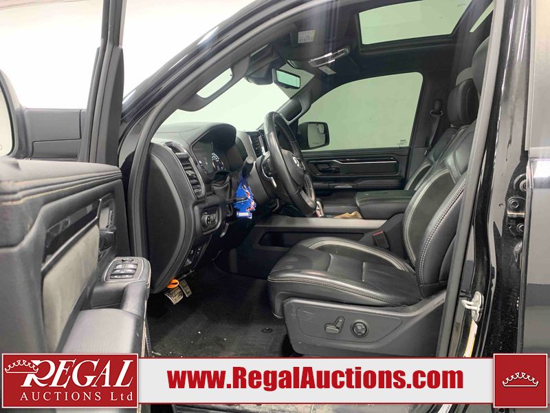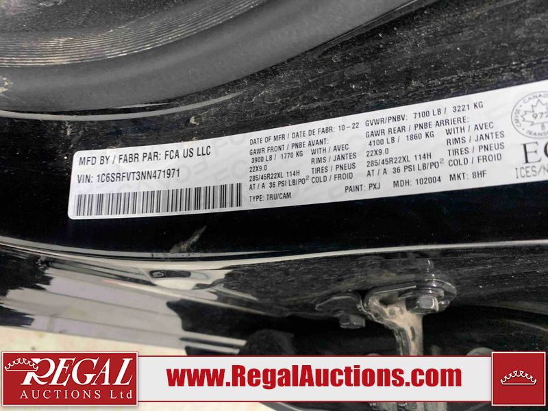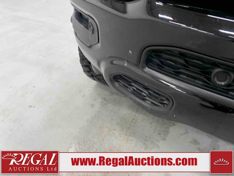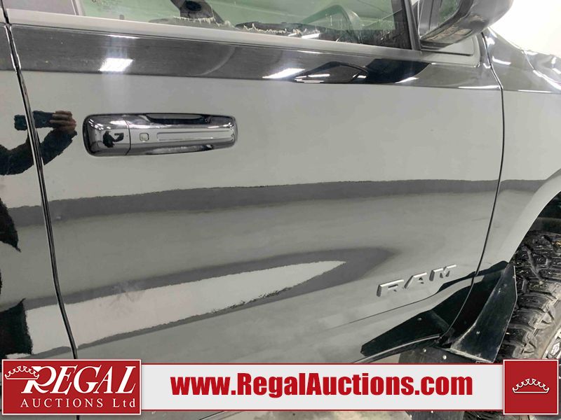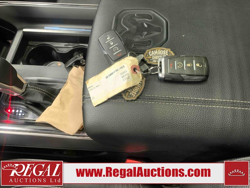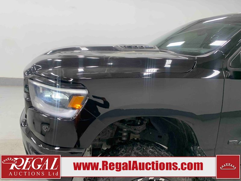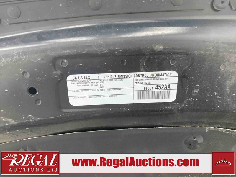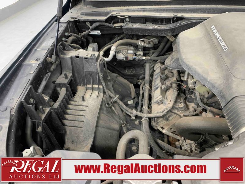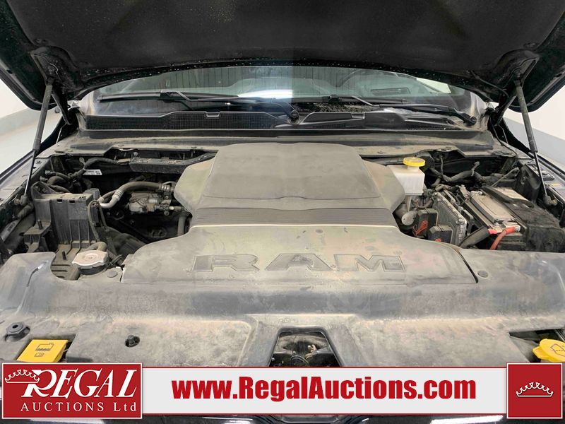 This 2022 RAM 1500 SPORT CREW CAB SWB 4WD 5.7L is powered by a 8 cylinder gasoline engine and an automatic transmission. It is equipped with four wheel drive. The truck has seats for 5 people. The truck has low mileage for its age. The vehicle has high value options including leather upholstery, power seats, heated seats, navigation, and a backup camera. The Check Engine light is on. The body looks to be in fair condition overall. There are chips on the front bumper, hood, roof, and right rear fender. There is slight paint peeling on the front bumper. There are scratches on the tail gate. There is incidental dent damage on the tail gate. There are very minor scratches in many areas around the body. There are very minor chips in many areas around the body. The interior looks to be in good condition overall. The carpet is dirty. All of the tires have lots of tread remaining. Aftermarket suspension has been installed. Aftermarket alloy rims with tires have been mounted, the factory alloys are missing.