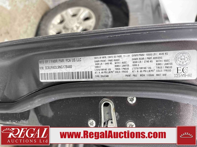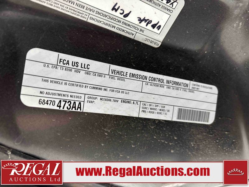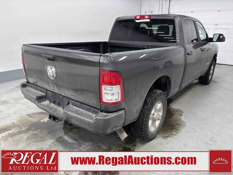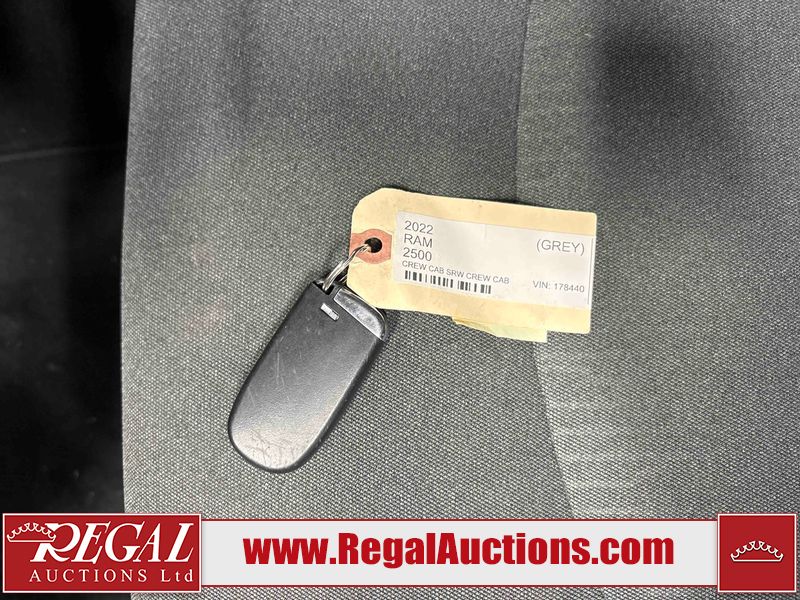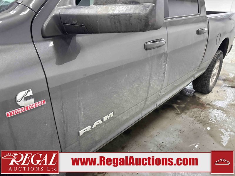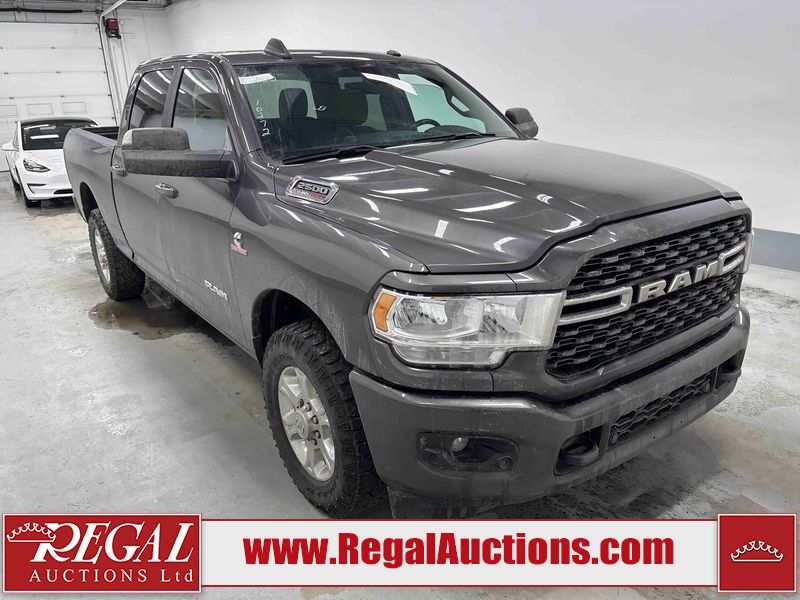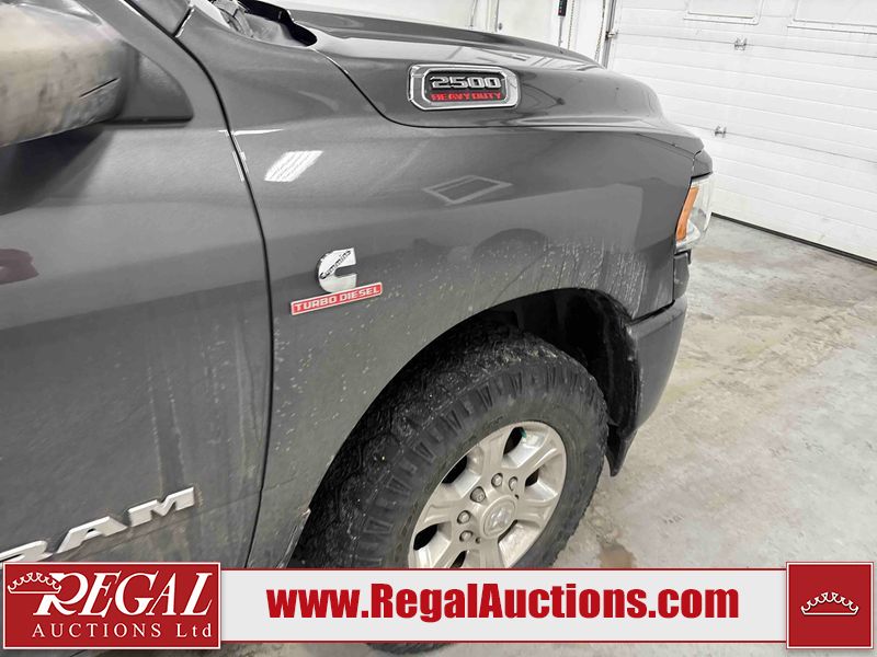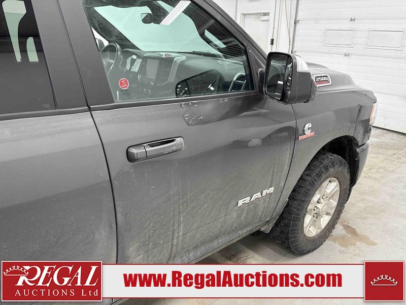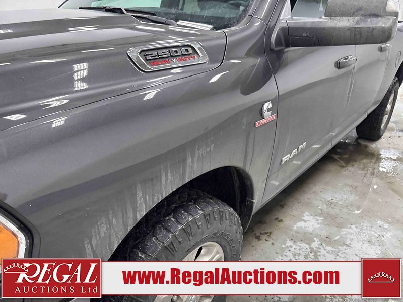 This 2022 RAM 2500 CREW CAB RWD is powered by a turbocharged 6.7L V6 cylinder diesel engine and an automatic transmission. It is a two-wheel drive model. The truck has seats for 6 people. The truck has low mileage for its age. The vehicle has high-value options including power seats and a backup camera. The body looks to be in good condition overall. There are incidental scratches on the left front door and left rear door. There are very minor chips in many areas around the body. There are very minor scratches in many areas around the body. There is very minor dent damage in some areas around the body. The interior looks to be in good condition overall. The windshield is chipped. All of the tires have lots of tread remaining. This truck is being sold by a private individual. Regal Auctions Ltd. makes no guarantee or warranty, either express or implied, with respect to the data provided in this report. The information has been provided from the consignor and from sources generally believed to be reliable, however the accuracy of this information cannot be guaranteed by Regal Auctions.
