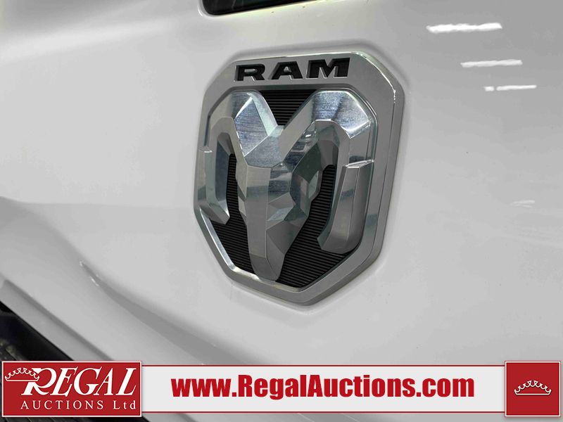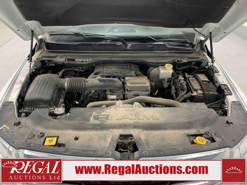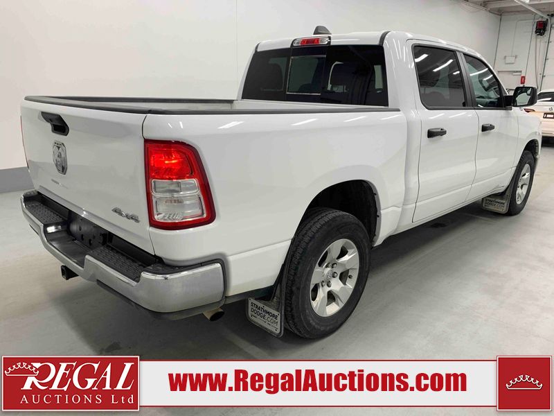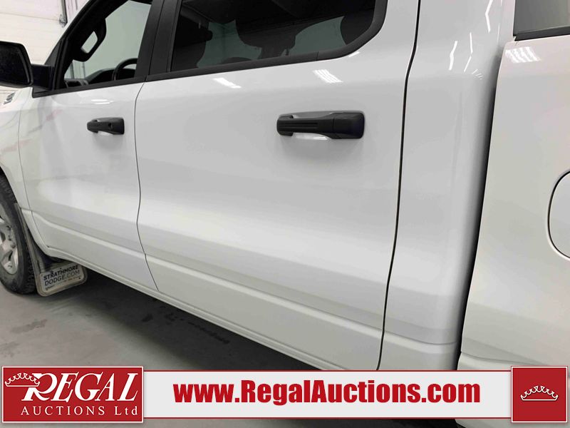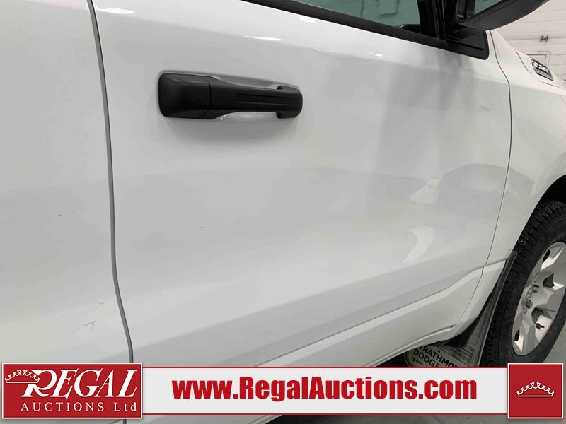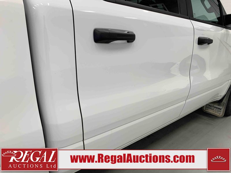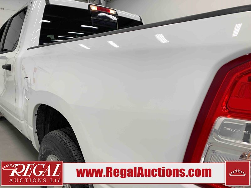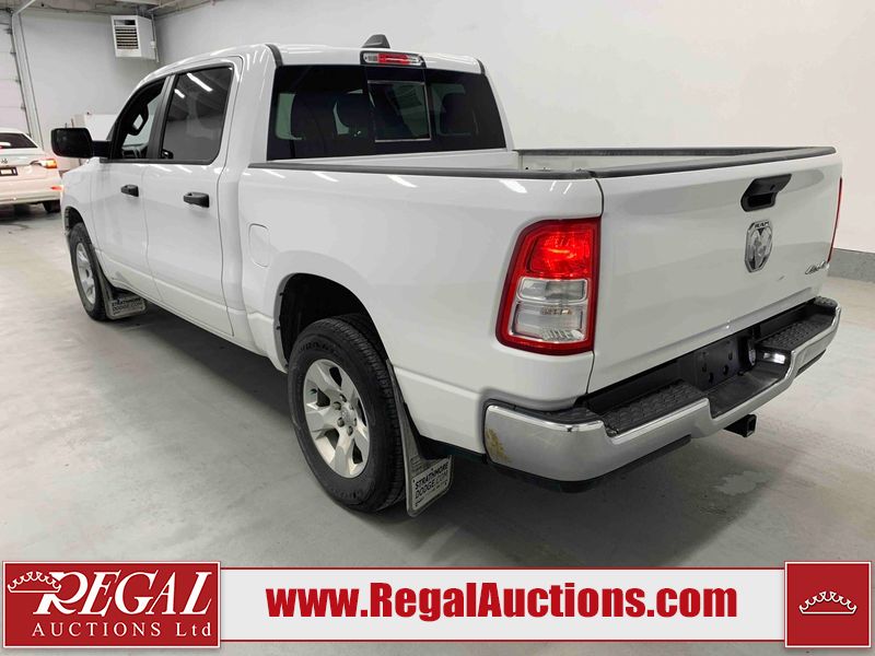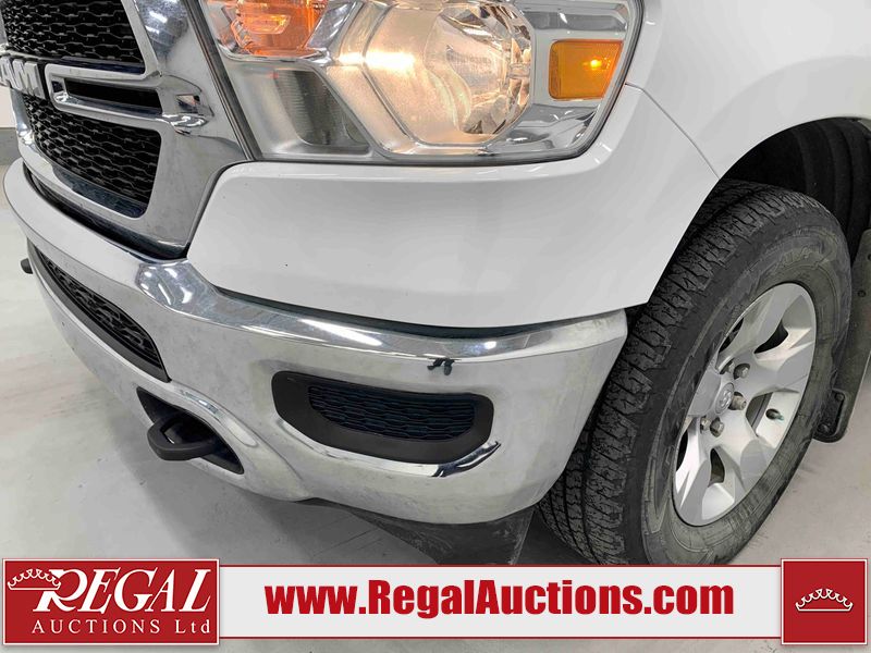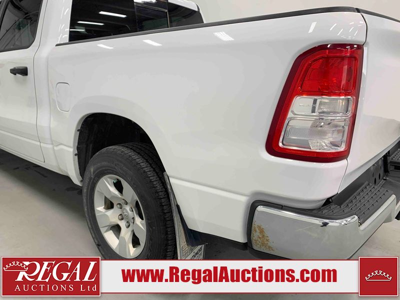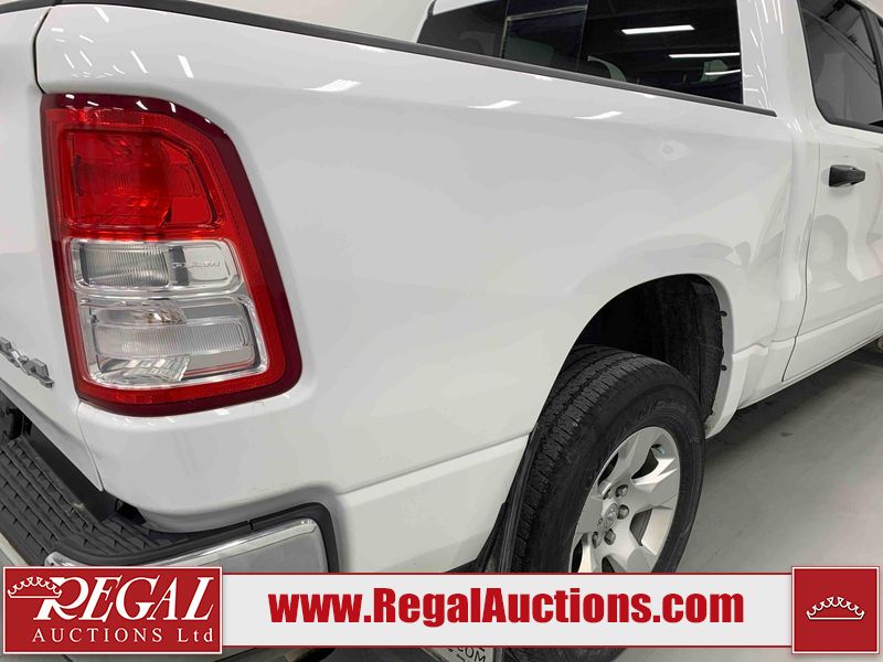 This 2023 RAM 1500 TRADESMAN CREW CAB SWB 4WD 5.7L is powered by a 8 cylinder e-torque gasoline engine and an automatic transmission. It is equipped with four wheel drive. The truck has seats for 6 people. The truck has high mileage for its age. The vehicle has high value options including a backup camera. The body looks to be in good condition overall. There are chips on the front bumper and roof. There are very minor scratches in many areas around the body. There are very minor chips in many areas around the body. There is very minor dent damage on the right rear door. The interior looks to be in fair condition overall. The rear seats are stained. The carpet is dirty. The roofliner is dirty. The windshield is chipped. The rear tires are worn. The front tires have lots of tread remaining.