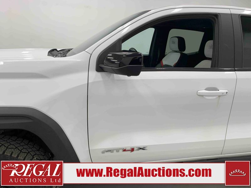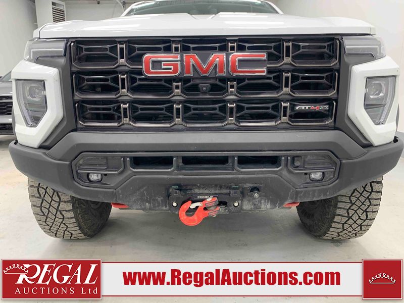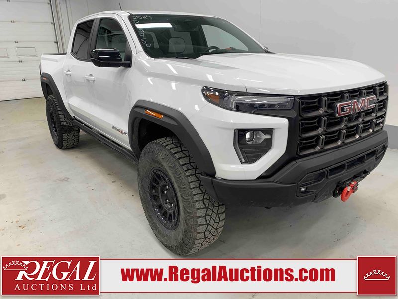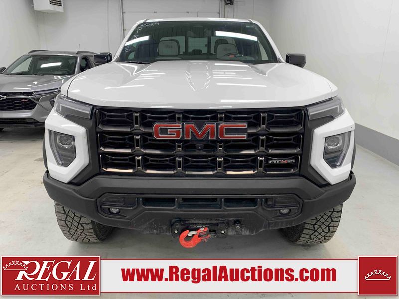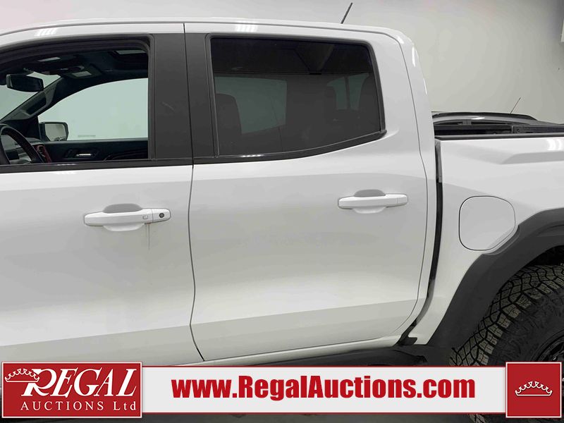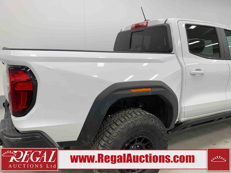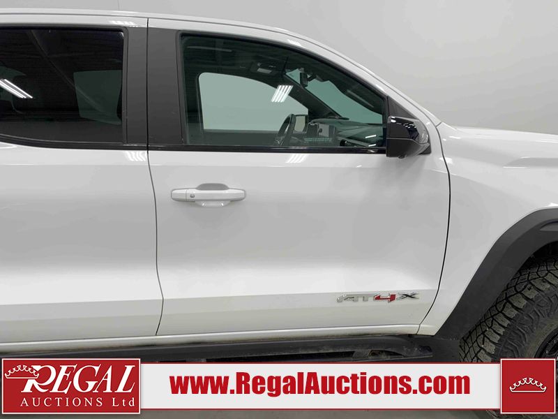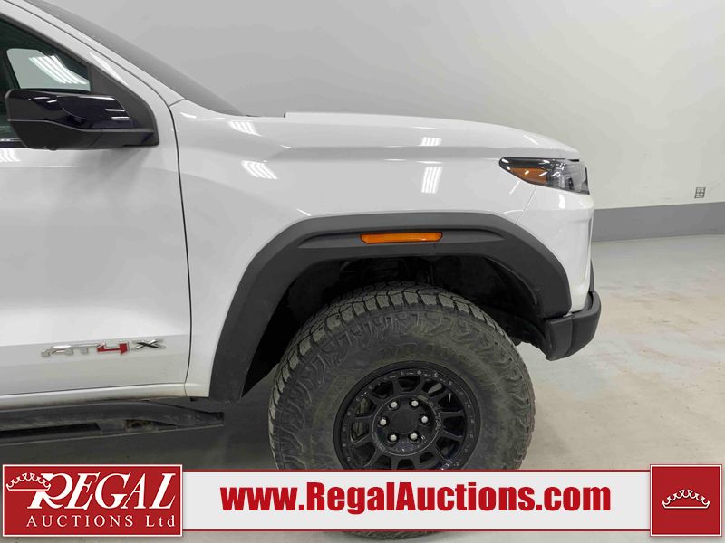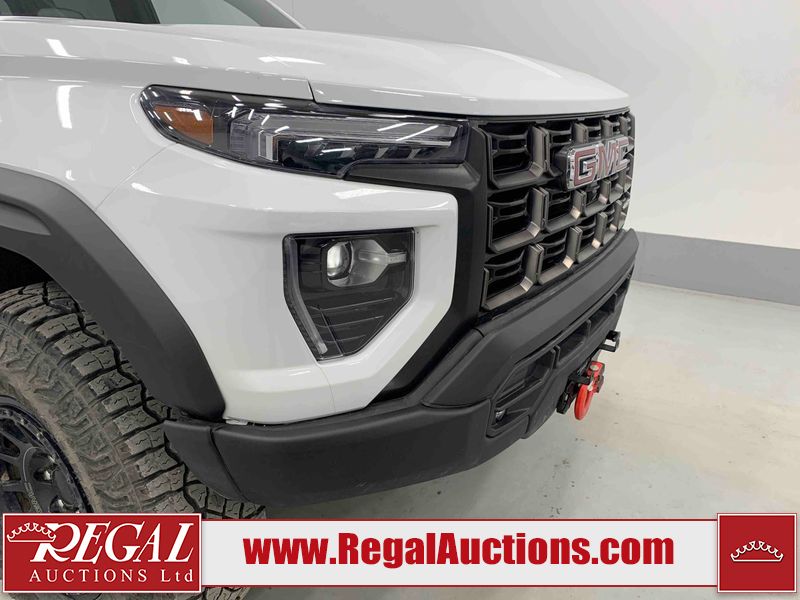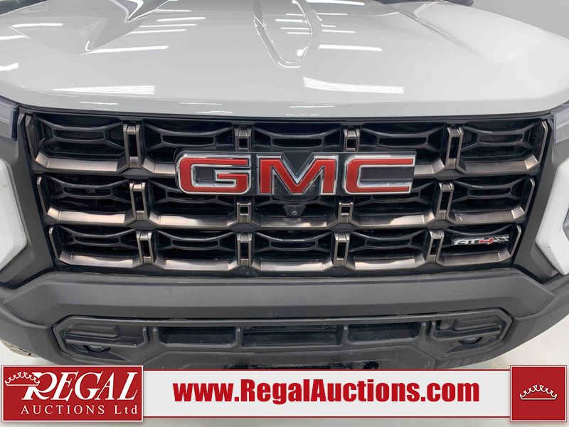 This 2024 GMC CANYON AT4X CREW CAB SWB 4WD 2.7L is powered by a turbocharged 4 cylinder gasoline engine and an automatic transmission. It is equipped with four wheel drive. The truck has seats for 5 people. The truck has low mileage for its age. The vehicle has high value options including leather upholstery, power seats, heated seats, navigation, and a backup camera. The body looks to be in good condition overall. There are slight chips on the left rear fender. There are very minor chips in many areas around the body. There are very minor scratches in many areas around the body. The interior looks to be in good condition overall. The carpet is dirty. The windshield looks to be in good condition. All of the tires have lots of tread remaining.