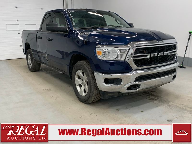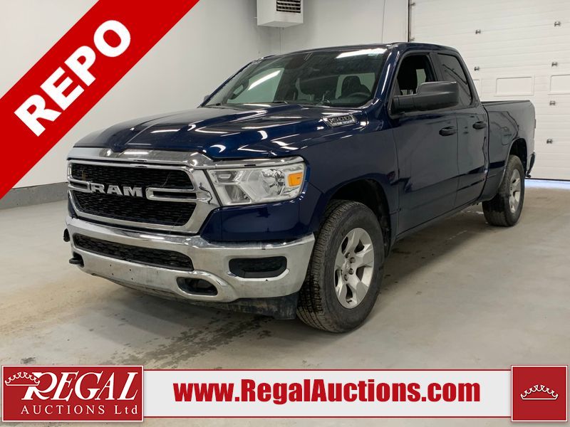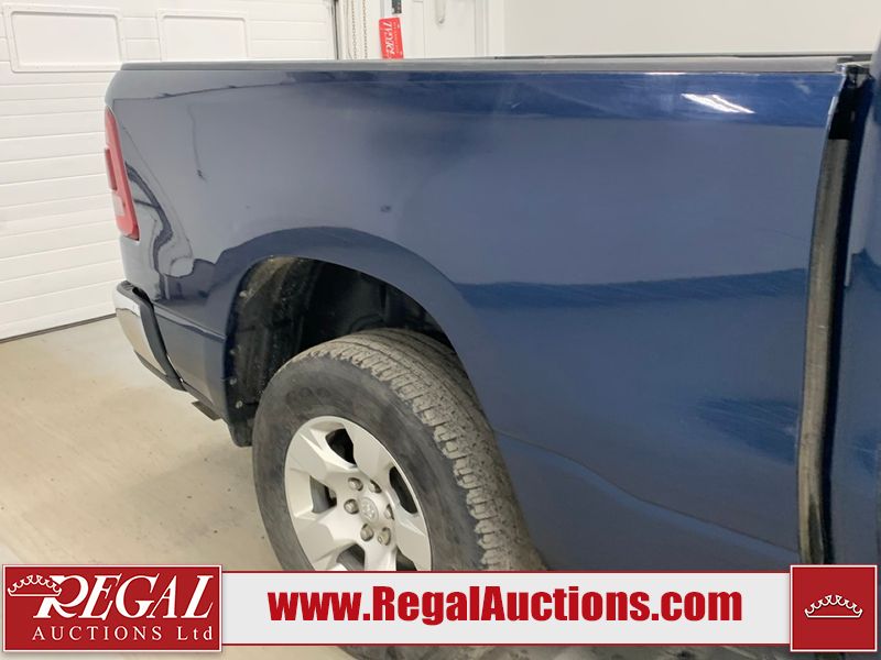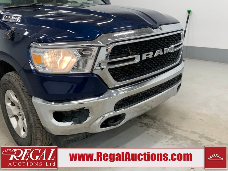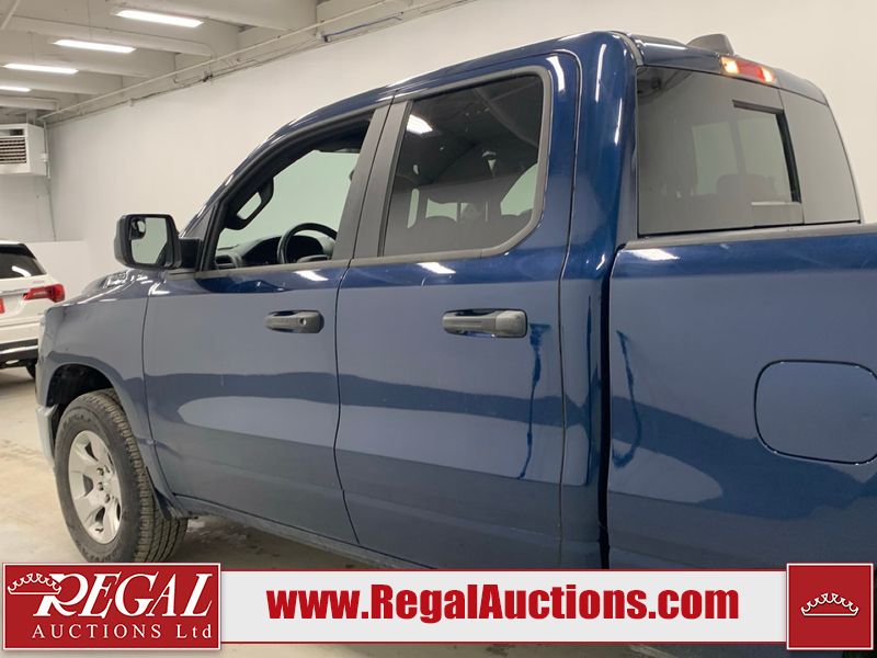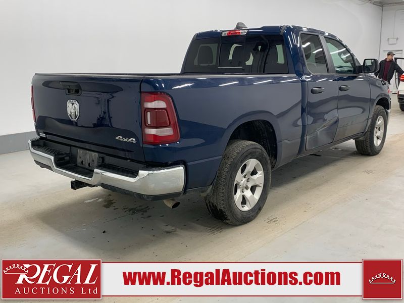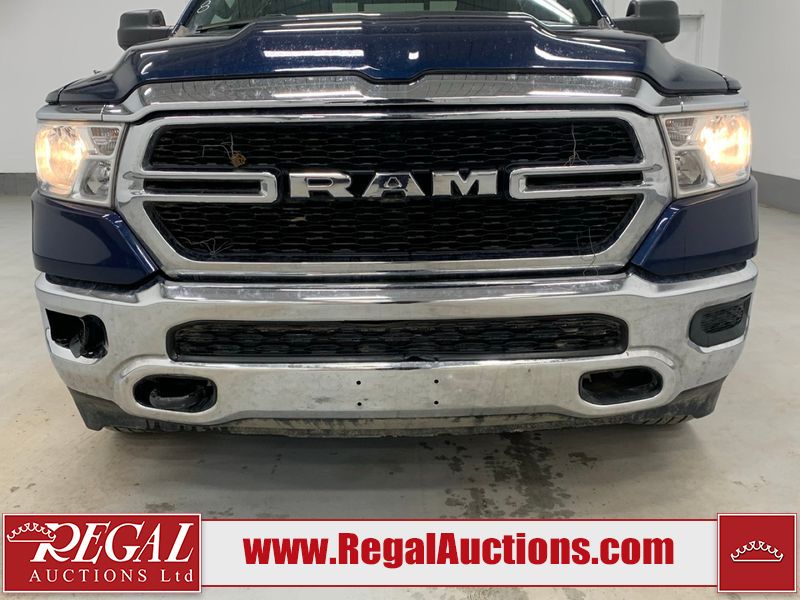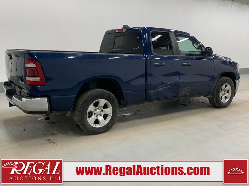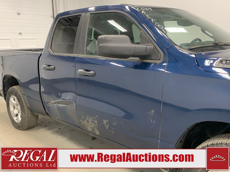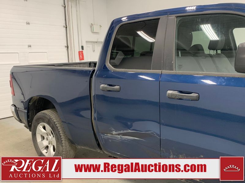 This 2024 RAM 1500 TRADESMAN QUAD CAB 4WD SWB 5.7L is powered by a 8 cylinder gasoline engine and an automatic transmission. It is equipped with four wheel drive. The truck has seats for 4 people. The mileage is average considering the truck's age. The body looks to be in fair condition overall. There is extensive dent damage on the right rear door. There are moderate scratches on the right rear door. There are scratches on the hood, left front door, left rear door, left rear fender, tail gate, right rear fender, right front door, and right front fender. There is dent damage on the left front fender and right rear fender. There are slight chips on the right rear door. There are very minor scratches in a few areas around the body. There are very minor chips in many areas around the body. The interior looks to be in fair condition overall. The dashboard, driver's seat, passenger seat, rear seats, and doors are dirty. The windshield is cracked. The rear tires are worn. The front tires have lots of tread remaining.
