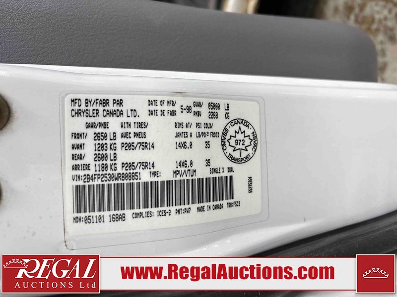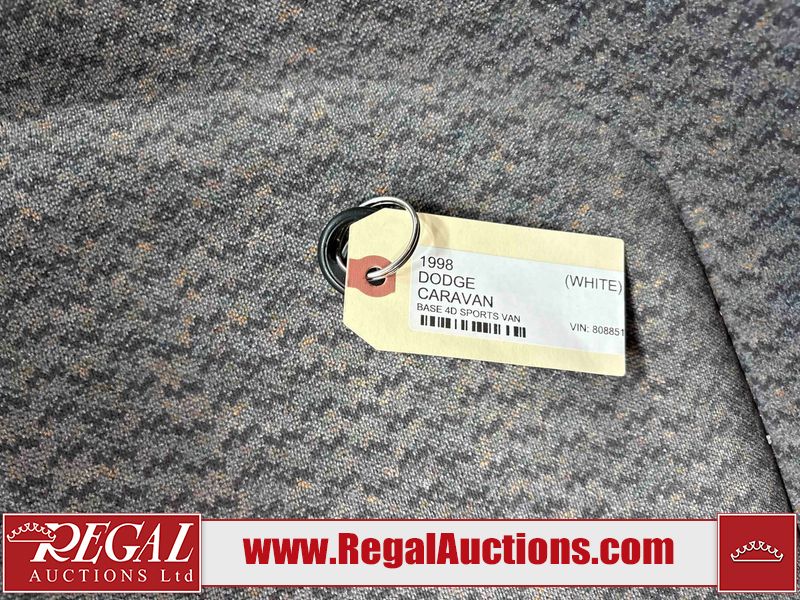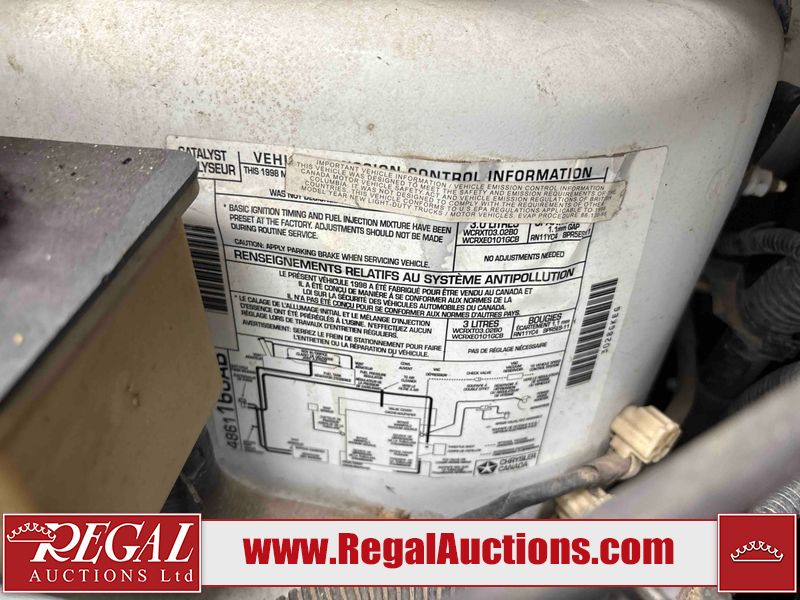 This 1998 DODGE CARAVAN BASE 4D SPORTS VAN is powered by a 3.0 liter 6-cylinder gasoline engine and an automatic transmission. The van has seats for 7 people. The vehicle does not have power windows or power locks. The dashboard light system is malfunctioning, and the dashboard lights don't work. The Maintenance light is on. The body looks to be in fair condition overall. There is substantial rust on the right rear fender. There is a fair amount of rust on the left rear door. There is rust on the hood, left rear fender, and rear door. There is minor dent damage on the rear door. There are chips in many areas around the body. There are scratches in many areas around the body. The interior looks to be in good condition overall. The windshield is cracked. The front tires are both worn. The rear tires both have lots of tread remaining. This van is being sold by a private individual. The vehicle will be sold with the following declarations: Auctioneer Announcement "**DASH GAGES DO NOT WORK** " and True Mileage Unknown (See Footnote 1). Footnotes: 1) The accuracy and history of the odometer reading cannot be verified and the current odometer reading is not believed to be correct. Regal Auctions Ltd. makes no guarantee or warranty, either express or implied, with respect to the data provided in this report. The information has been provided from the consignor and from sources generally believed to be reliable, however the accuracy of this information cannot be guaranteed by Regal Auctions.