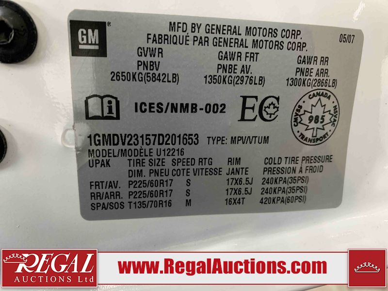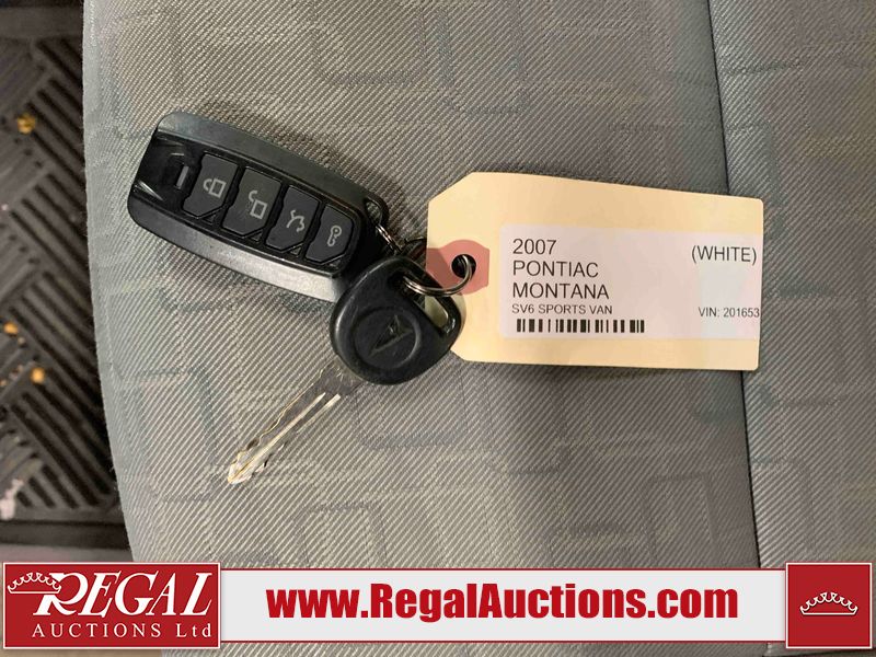 This 2007 PONTIAC MONTANA SV6 4D SPORTS VAN is powered by a 3.9L V6 gasoline engine and an automatic transmission. The van has seats for 7 people. The van has high mileage for its age. The body looks to be in fair condition overall. There is conspicuous rust on the roof. There are chips on the front bumper, hood, and left front fender. There is incidental dent damage on the hood. There are minimal scratches on the left front door, left rear door, and rear bumper. There are very minor chips in many areas around the body. There are very minor scratches in many areas around the body. The interior looks to be in good condition overall. The driver's seat is torn. The passenger side mirror housing is broken. The passenger side front tire and the driver's side rear tire are both worn. The other tires have lots of tread remaining. This van is being sold by an automotive broker. Regal Auctions Ltd. makes no guarantee or warranty, either express or implied, with respect to the data provided in this report. The information has been provided from the consignor and from sources generally believed to be reliable, however the accuracy of this information cannot be guaranteed by Regal Auctions.