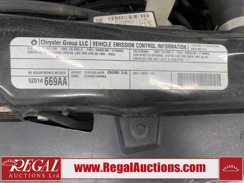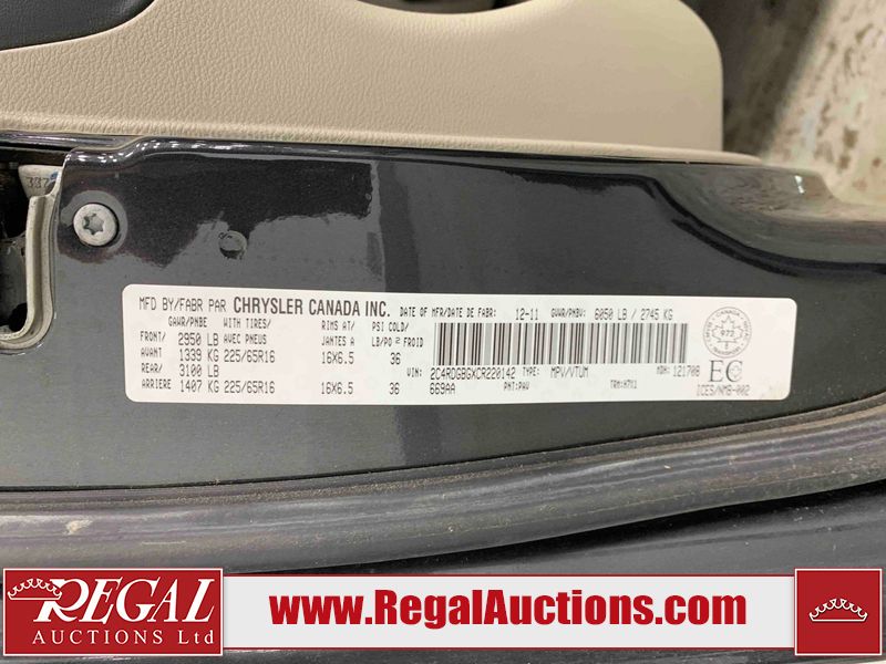 This 2012 DODGE GRAND CARAVAN 4D VAN is powered by a 3.6L V6 gasoline engine and an automatic transmission. The van has seats for 7 people. The mileage is average considering the van's age. The vehicle has high-value options including leather upholstery and a backup camera. The body looks to be in good condition overall. There are chips on the front bumper and rear bumper. There are scratches on the front bumper and rear bumper. There are very minor chips in many areas around the body. There are very minor scratches in many areas around the body. The interior looks to be in good condition overall. The driver's seat is worn. The windshield looks to be in good condition. All of the tires have lots of tread remaining. This van is being sold by an automotive broker. The vehicle will be sold with the following declarations: Out of Province - BC (See Footnote 1). Footnotes: 1) The vehicle's last registered jurisdiction is British Columbia. The purchaser must have the vehicle undergo and pass an Out of Province inspection before it can be registered in Alberta. Regal Auctions Ltd. makes no guarantee or warranty, either express or implied, with respect to the data provided in this report. The information has been provided from the consignor and from sources generally believed to be reliable, however the accuracy of this information cannot be guaranteed by Regal Auctions.
